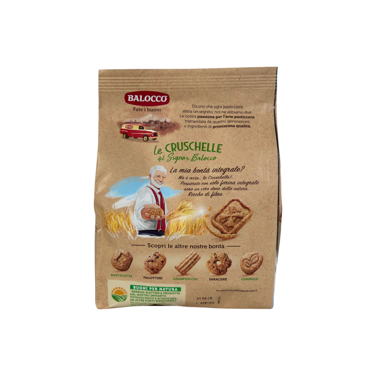 Печиво Cruschelle — це справжній смак традиційної Італії у здоровому форматі. Завдяки використанню цільнозернового борошна воно має насичений злаковий аромат, приємну хрусткість і природну солодкість. Виготовлене без консервантів, барвників, гідрогенізованих жирів і ГМО. Виробництво Balocco працює на відновлюваній енергії, що робить цей продукт ще екологічнішим. Ідеально для сніданку, перекусу або як легкий десерт до чаю.