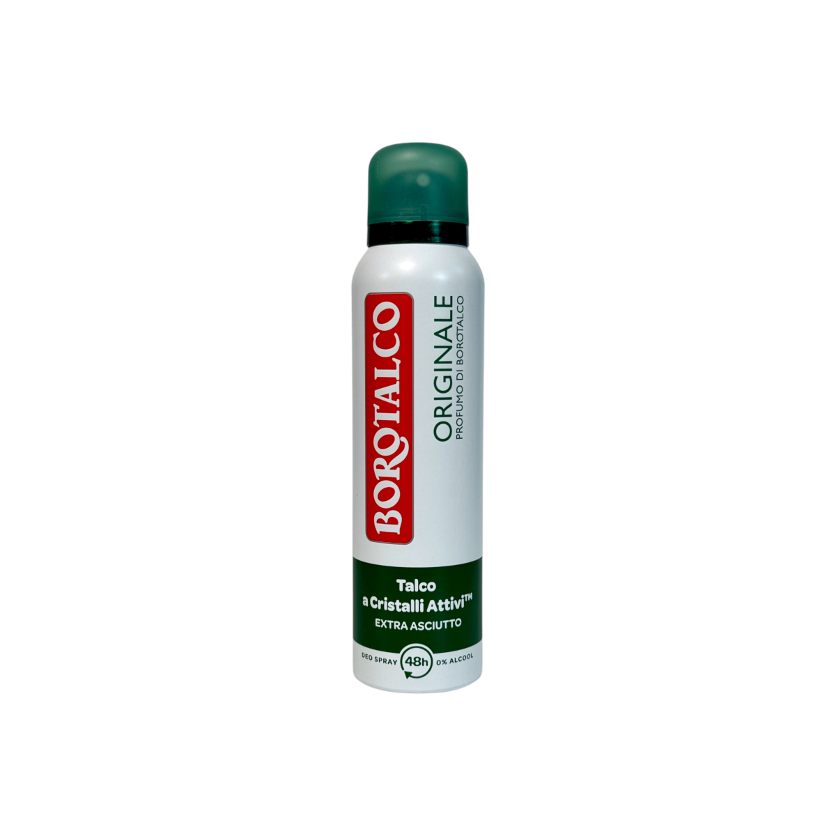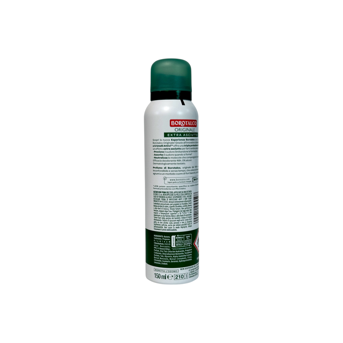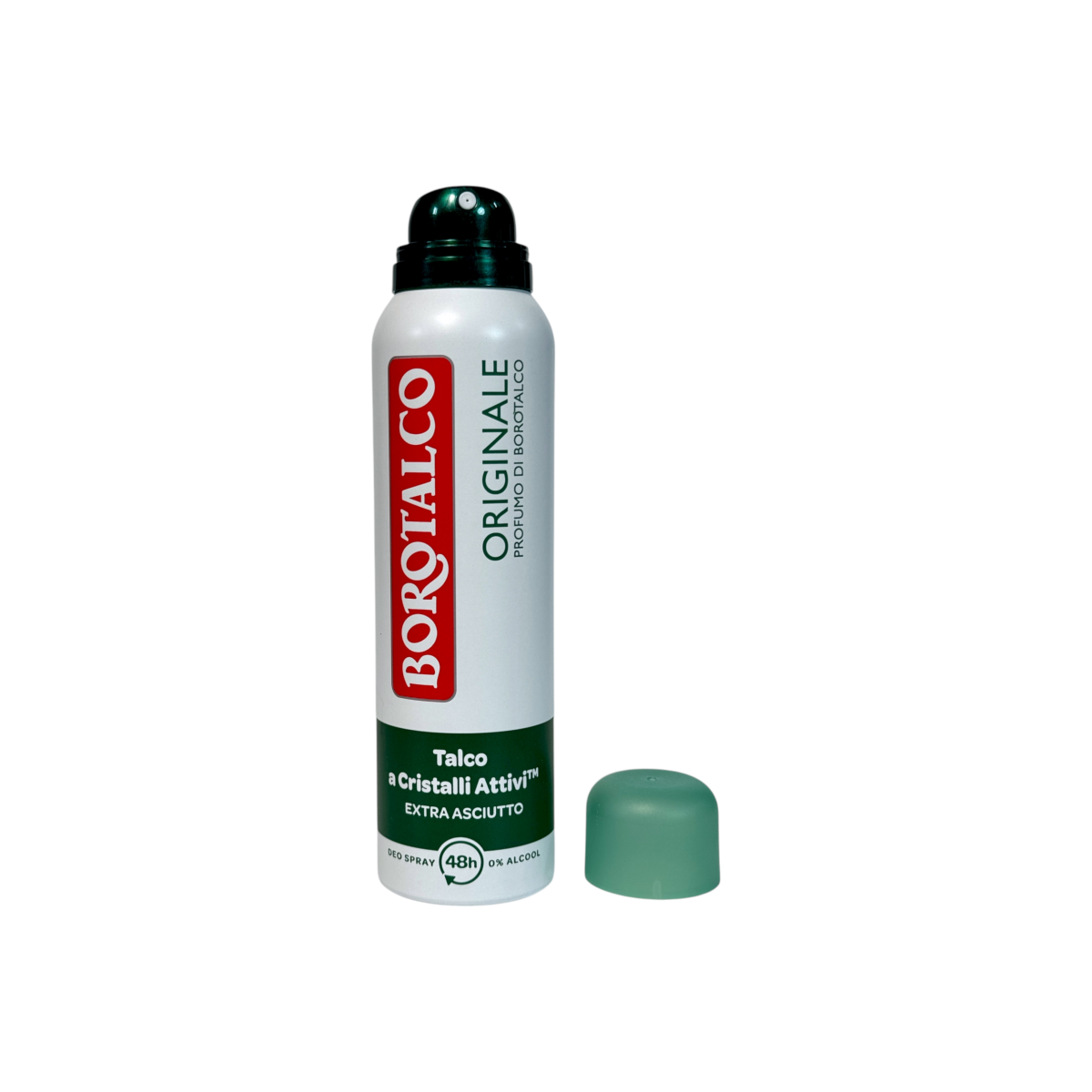 Borotalco Original Extra Asciutto — це класичний дезодорант-спрей з унікальним ароматом Borotalco, що забезпечує тривалий ефект свіжості до 48 годин. Завдяки запатентованій формулі з кристалами тальку (Talco a Cristalli Attivi™) він ефективно поглинає вологу, залишаючи шкіру сухою, м’якою та доглянутою без подразнень.