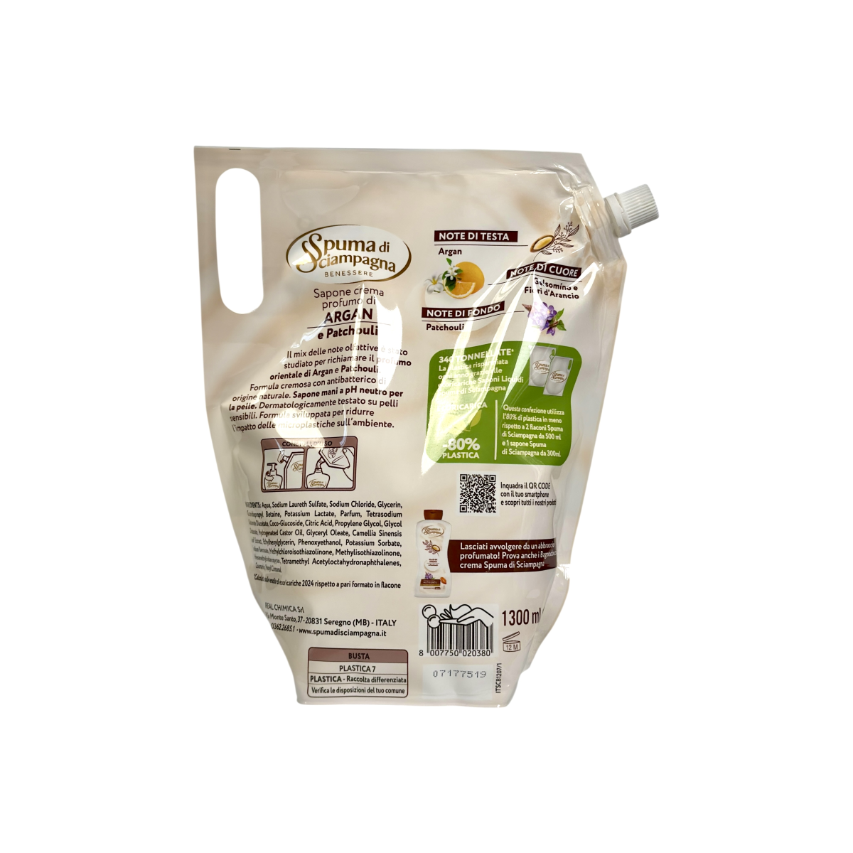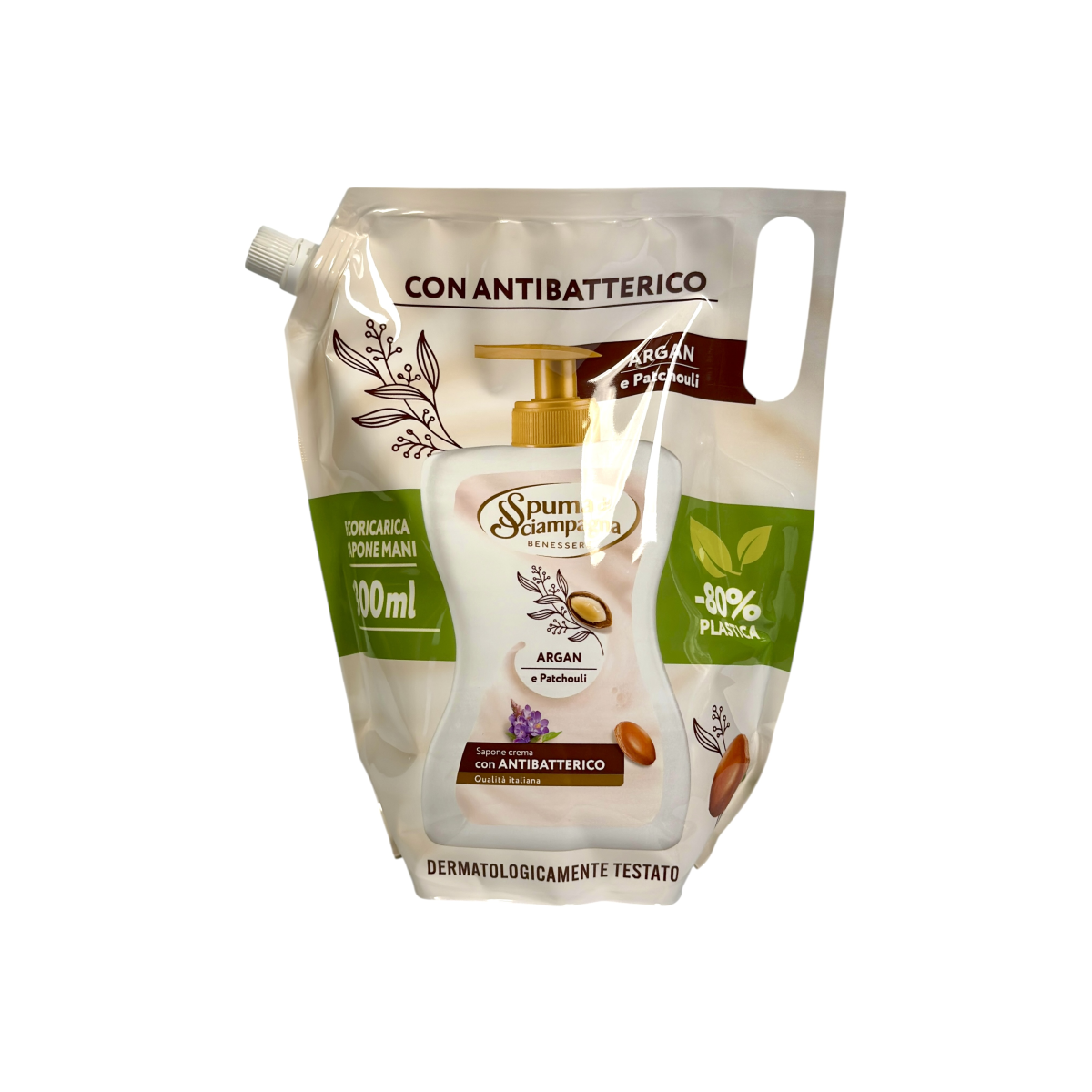 Відчуйте ніжність і турботу про шкіру з милом Spuma di Sciampagna Benessere Argan & Patchouli. Це оригінальний продукт італійського виробництва, створений для щоденного догляду. Кремова текстура м’яко очищує, зберігаючи природний баланс pH навіть для чутливої шкіри. Екстракт арганової олії живить та зволожує, а нотки пачулі дарують легкий східний аромат. Формула з антибактеріальним компонентом забезпечує додатковий захист, роблячи миття рук не лише приємним, а й безпечним. Екоупаковка зменшує використання пластику на 80%, що робить вибір ще більш відповідальним.