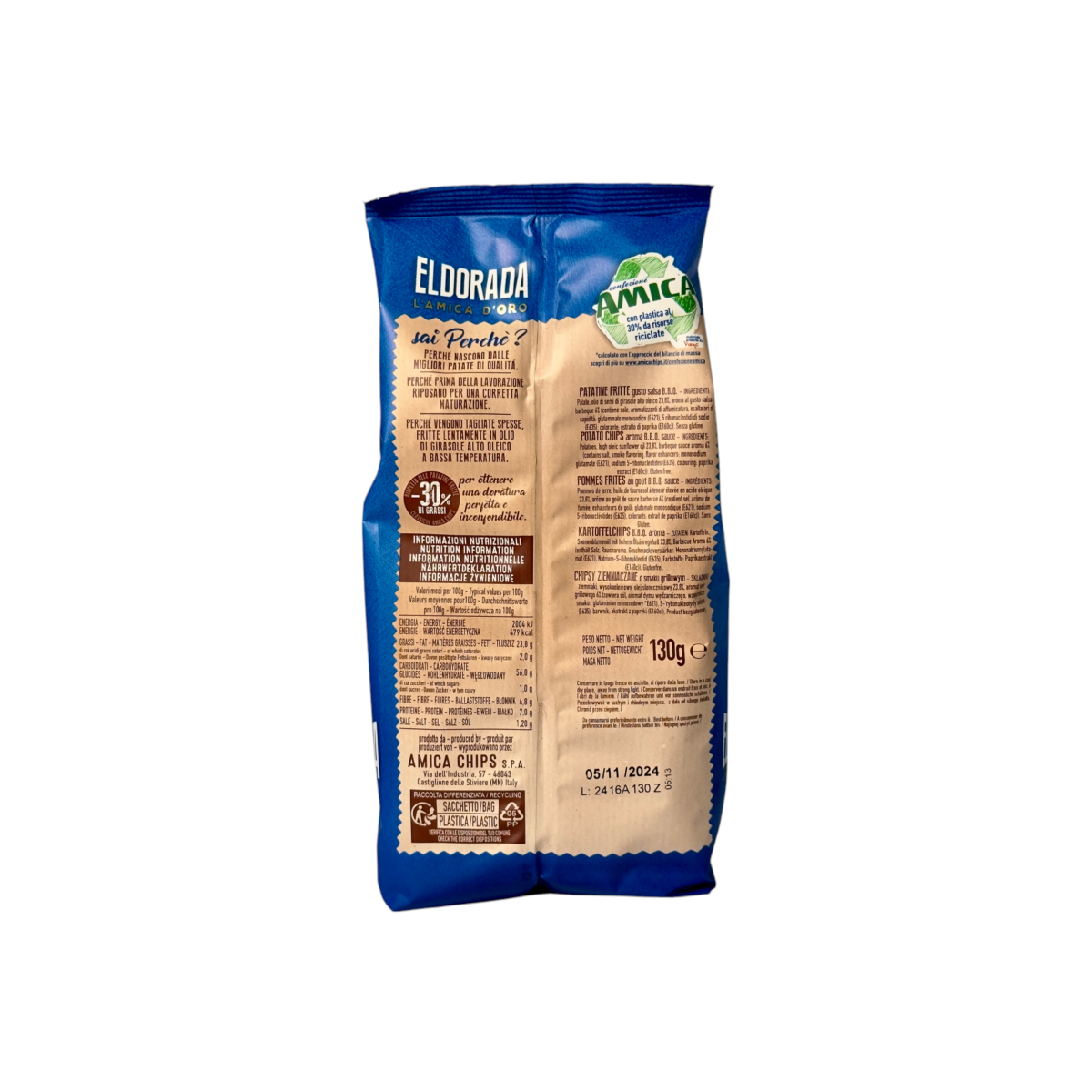 Лінійка Eldorada — це чіпси з товстішими скибочками («spessa e croccante»), які залишаються хрусткими довше і мають більш насичений смаковий профіль. Виробник Amica Chips S.p.A. — один із найвідоміших брендів Італії, який понад 30 років створює чіпси з неповторним смаком.