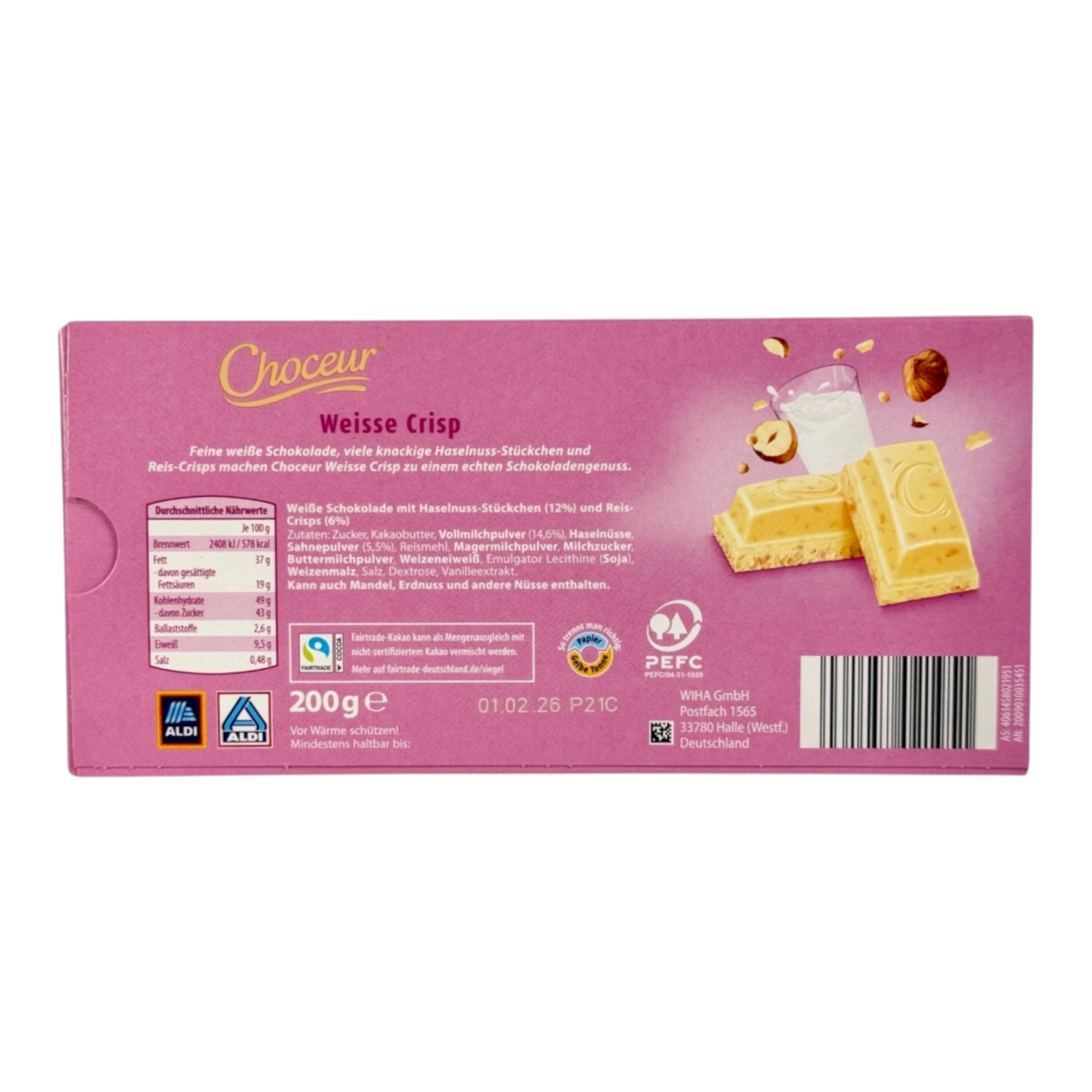 Choceur Weisse Crisp дарує справжнє задоволення від шоколаду: ніжний білий шоколад гармонійно поєднується з хрусткими шматочками фундука (12%) і рисовими кульками (6%). Це смачний десерт для щоденного задоволення або святкових моментів. Продукт виготовлений із сертифікованого Fairtrade-какао, що гарантує високу якість та відповідальне виробництво.