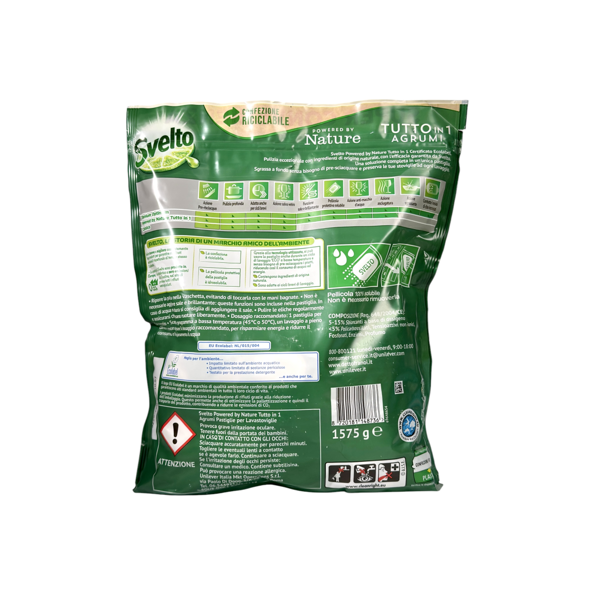 Таблетки для посудомийної машини Svelto Tutto in 1 Agrumi — це ідеальне рішення для щоденного миття посуду. Потужна формула на основі натуральних інгредієнтів ефективно видаляє жир, залишки їжі та запахи, навіть у коротких циклах. Натуральний аромат цитрусових додає свіжості.