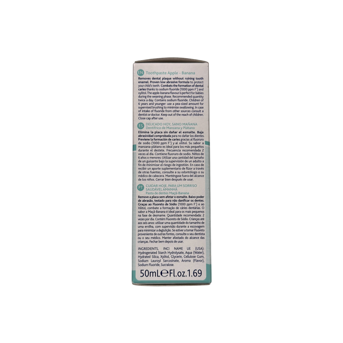 М’яка і безпечна дитяча зубна паста зі смаком яблука та банана, розроблена спеціально для малюків 6–24 місяців, щоб ніжно очищати перші зубки, не пошкоджуючи емаль.