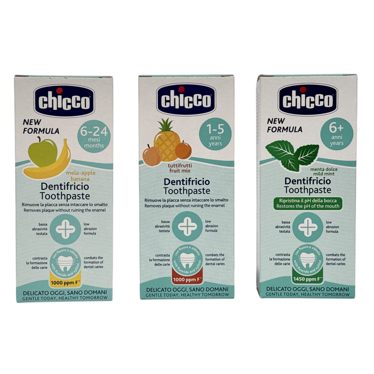 Chicco Dentifricio Mela-Banana — це італійська зубна паста для малюків, створена з урахуванням особливостей молочних зубів. Вона має низький рівень абразивності (RDA 27) та містить фтор (1000 ppm) і ксиліт, що ефективно запобігають утворенню карієсу. Ніжна текстура й приємний фруктовий смак роблять процес чищення зубів приємним і звичним для дитини. Паста не піниться надмірно та не подразнює слизову, тому підходить для щоденного використання з перших зубчиків.