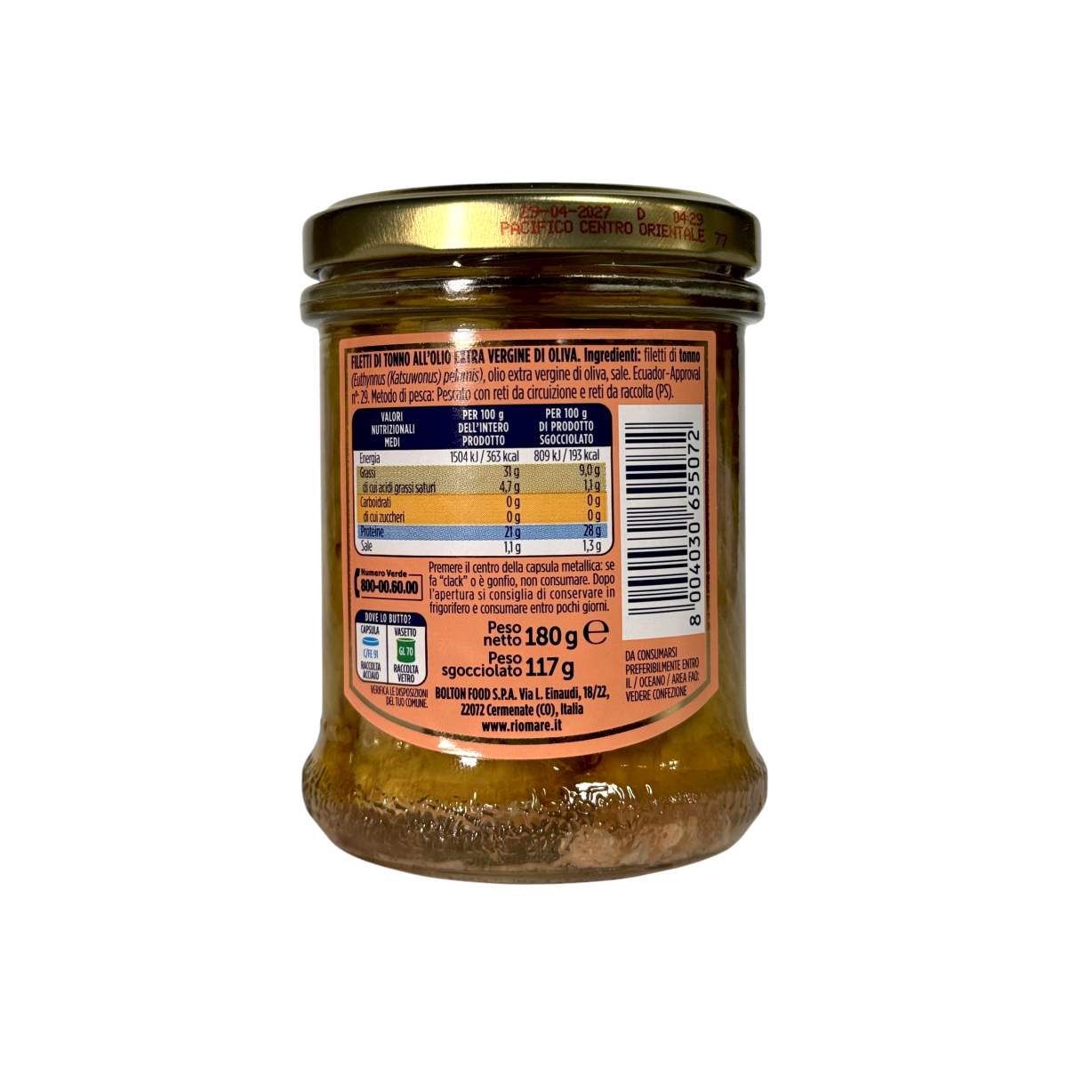 Філе тунця Rio Mare Filetti di Tonno виробляється виключно з добірного тунця (Katsuwonus pelamis), виловленого у відкритому морі за сертифікованими стандартами сталого рибальства. Кожне філе обробляється вручну, потім заливається найкращою оливковою олією Extra Vergine, щоб зберегти ніжну текстуру та природний смак риби. Ідеально для салатів, пасти, брускет або як окремий делікатес.