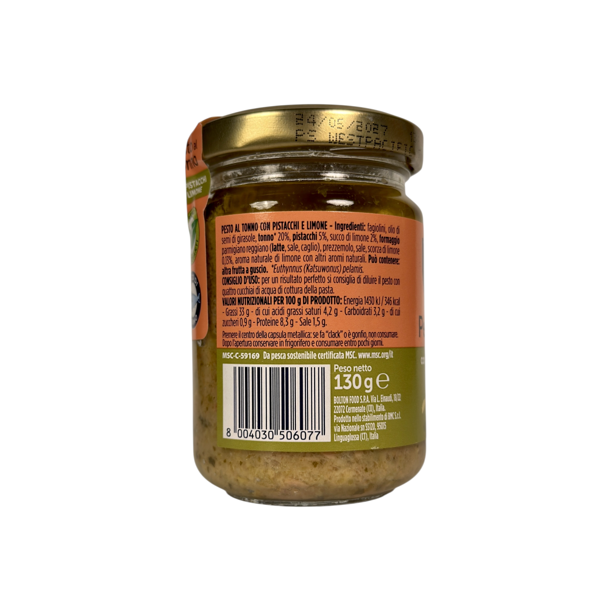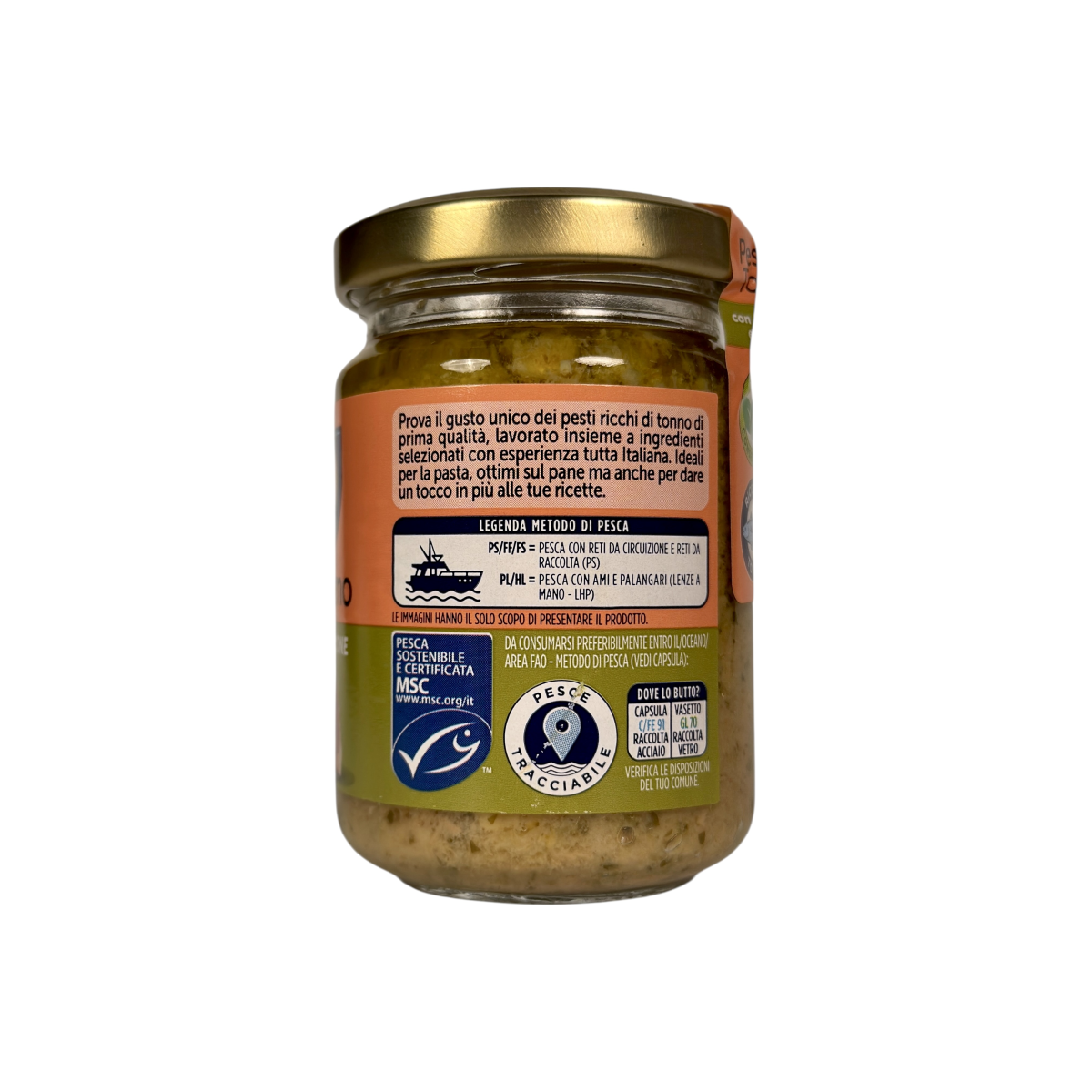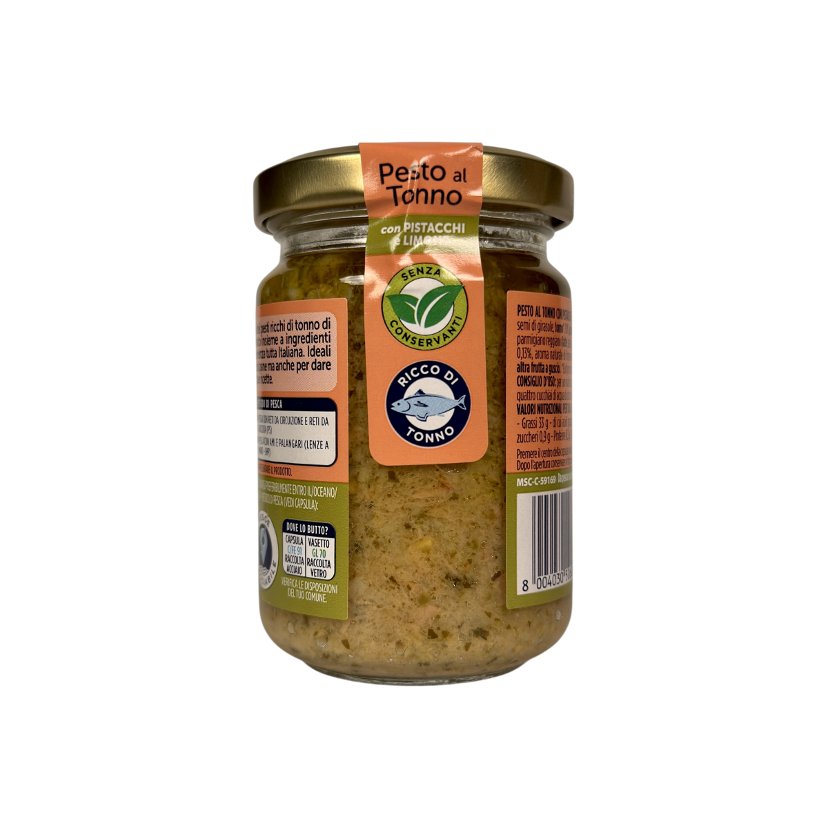 Створений брендом Rio Mare — лідером серед італійських морепродуктів, цей соус поєднує ніжність тунця з пікантністю фісташок і свіжістю лимона. Завдяки збалансованому складу та використанню натуральних інгредієнтів, песто має м’який аромат і кремову консистенцію. Ідеально підходить для пасти, холодних салатів, канапок або як соус до риби.