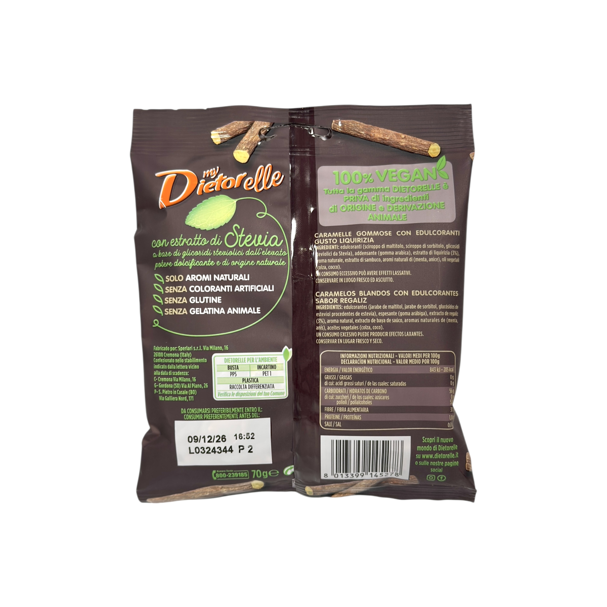 Dietorelle — відомий італійський бренд солодощів без цукру, створений для тих, хто хоче поєднувати смак і турботу про здоров’я. Цукерки My Dietorelle Liquirizia виготовлені зі стевією, без глютену, без желатину тваринного походження та без штучних барвників. Вони мають насичений смак лакриці та приємну м’яку жувальну текстуру. Ідеальний вибір для веганів, а також тих, хто дотримується здорового харчування чи контролює споживання цукру.