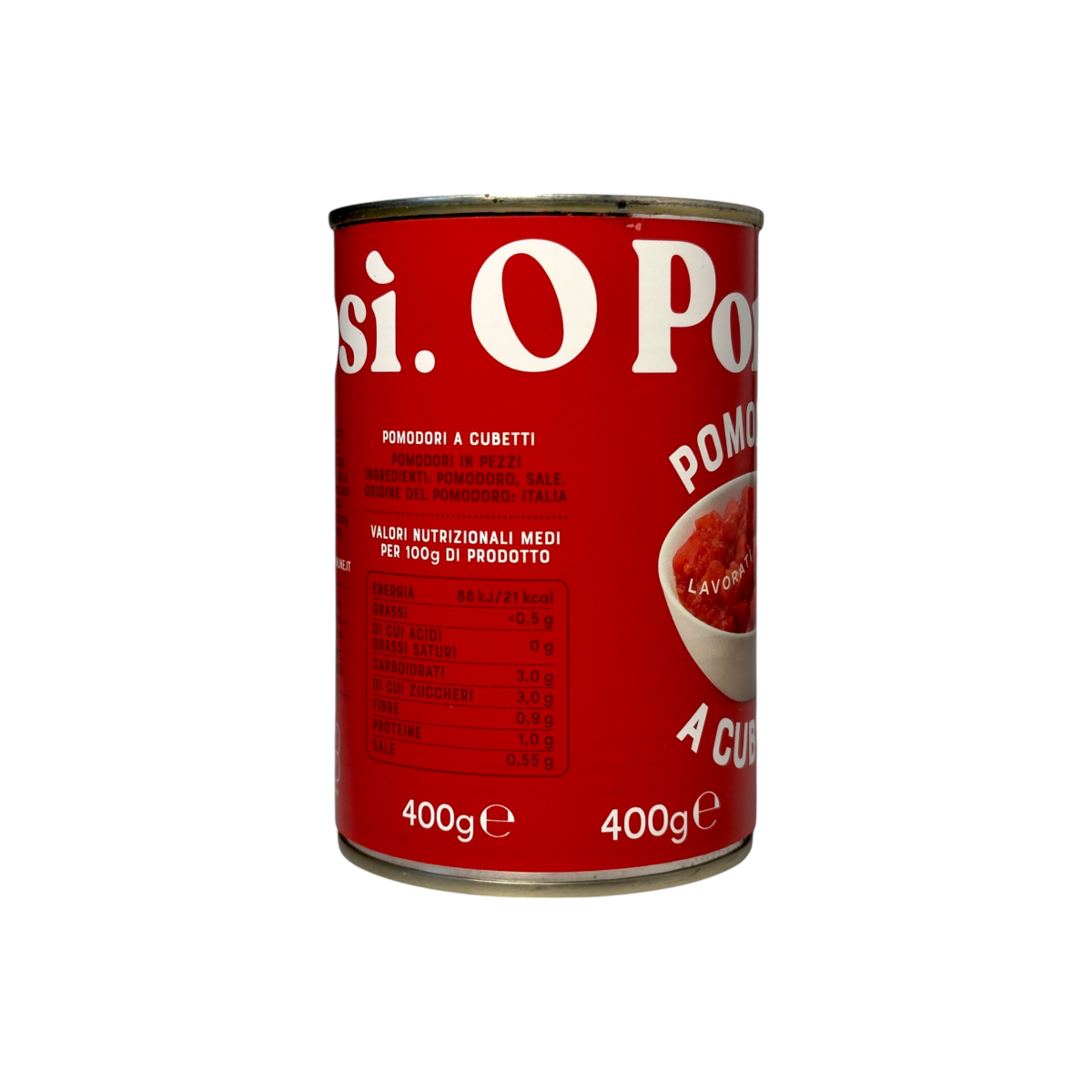 Натуральні італійські томати Pomì Pomodori a Cubetti — це подрібнені кубиками стиглі помідори, зібрані на піку зрілості та оброблені протягом кількох годин після збору. Ідеальні для соусів, пасти, піци, рагу та овочевих страв.