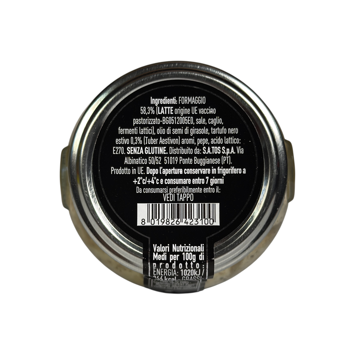• Склад: сир із пастеризованого молока (58,3%), соняшникова олія, чорний літній трюфель 0,3% (Tuber Aestivum), спеції (перець, аромати), сіль, молочнокислі закваски, кальцій, молочна кислота (E270)