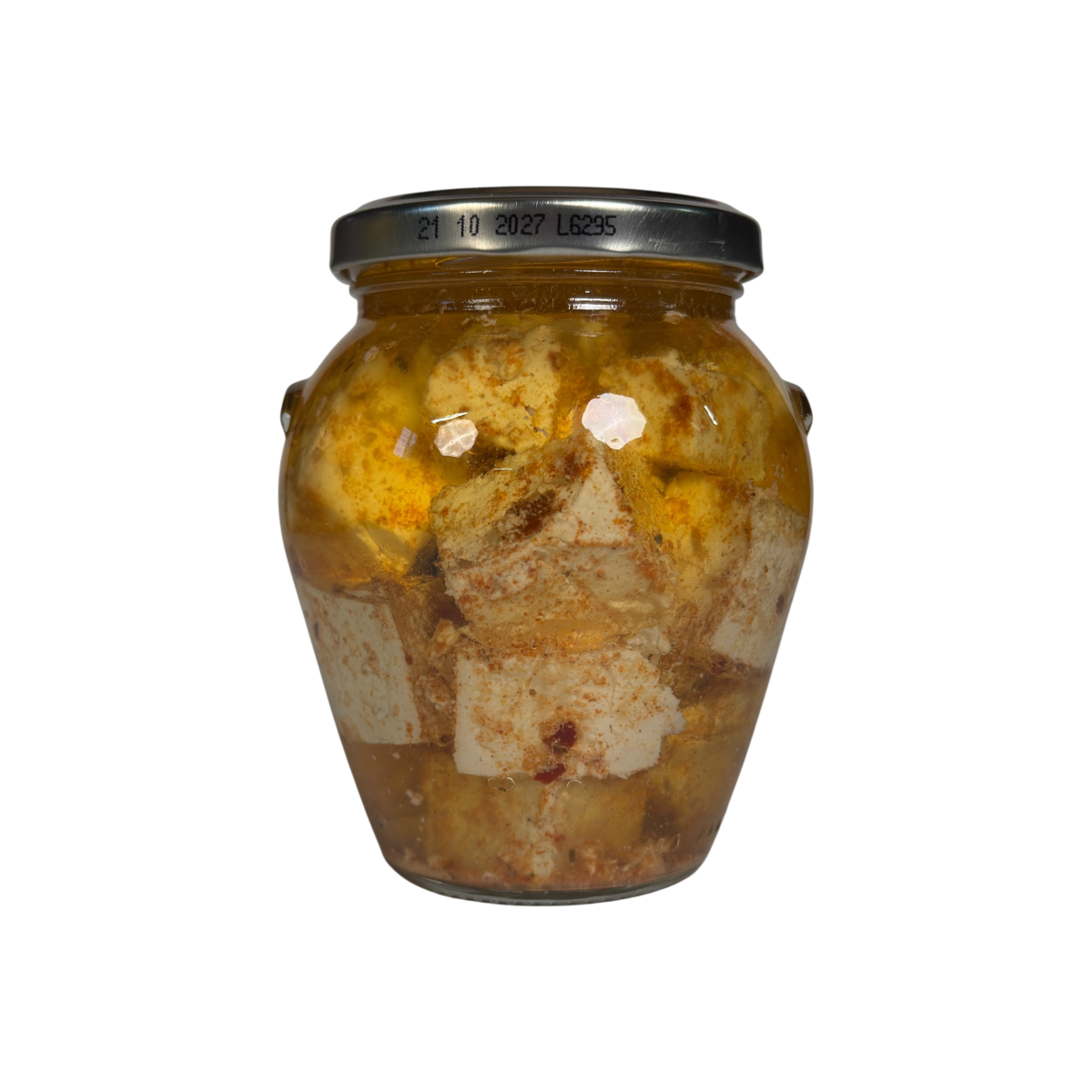 Ароматна італійська закуска — кубики сиру з пікантними спеціями, мариновані у соняшниковій олії.