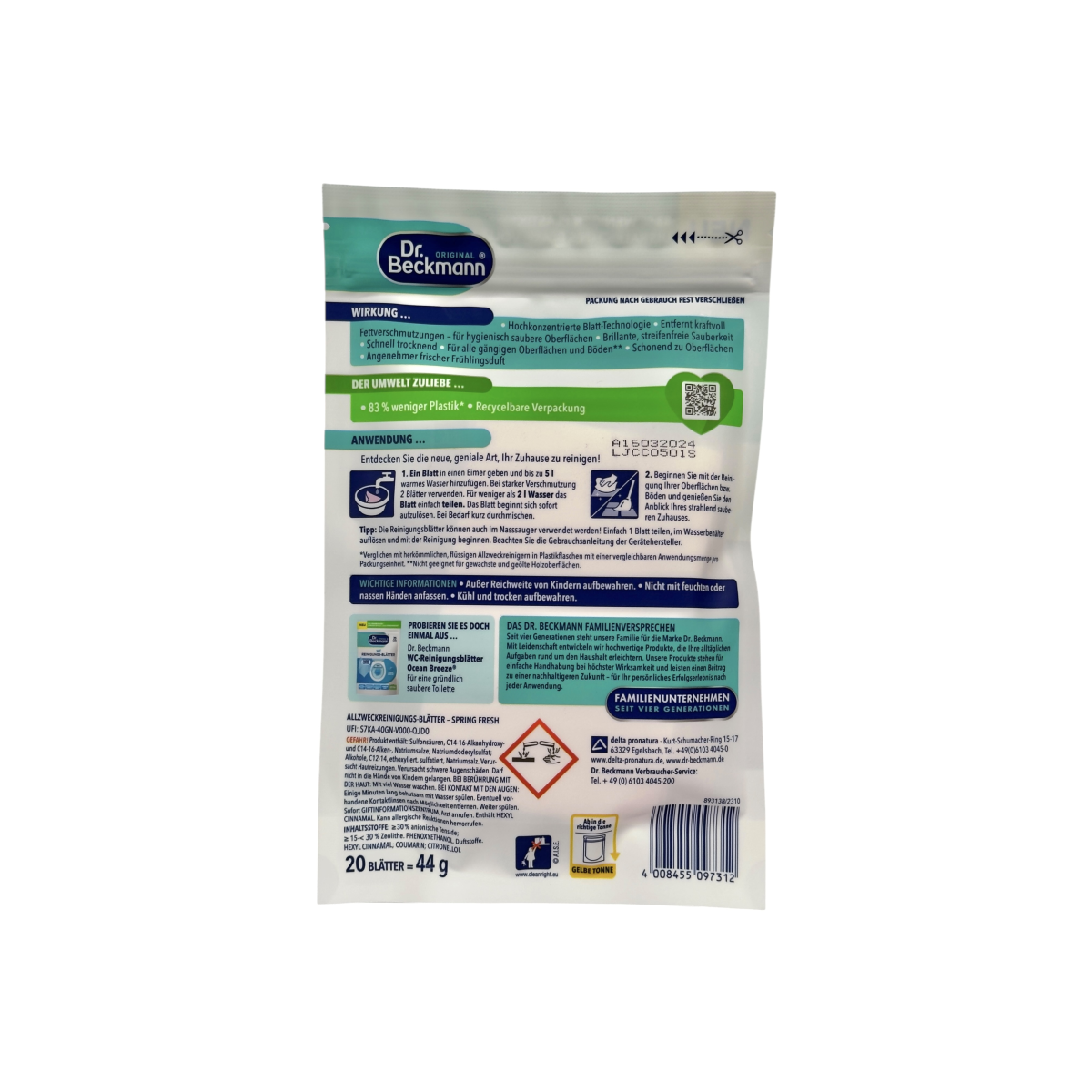 Dr. Beckmann Magic Leaves Spring Fresh — це інноваційна форма засобу для прибирання, яка поєднує ефективність концентрату та екологічність. Кожен лист повністю розчиняється у воді, створюючи потужний очищувальний розчин, що видаляє жир, пил і бруд з усіх типів поверхонь. Має приємний весняний аромат, не залишає розводів і забезпечує гігієнічну чистоту. Формула створена для дбайливого догляду за поверхнями та підлогами. Упаковка виготовлена з перероблюваних матеріалів і містить на 83% менше пластику.