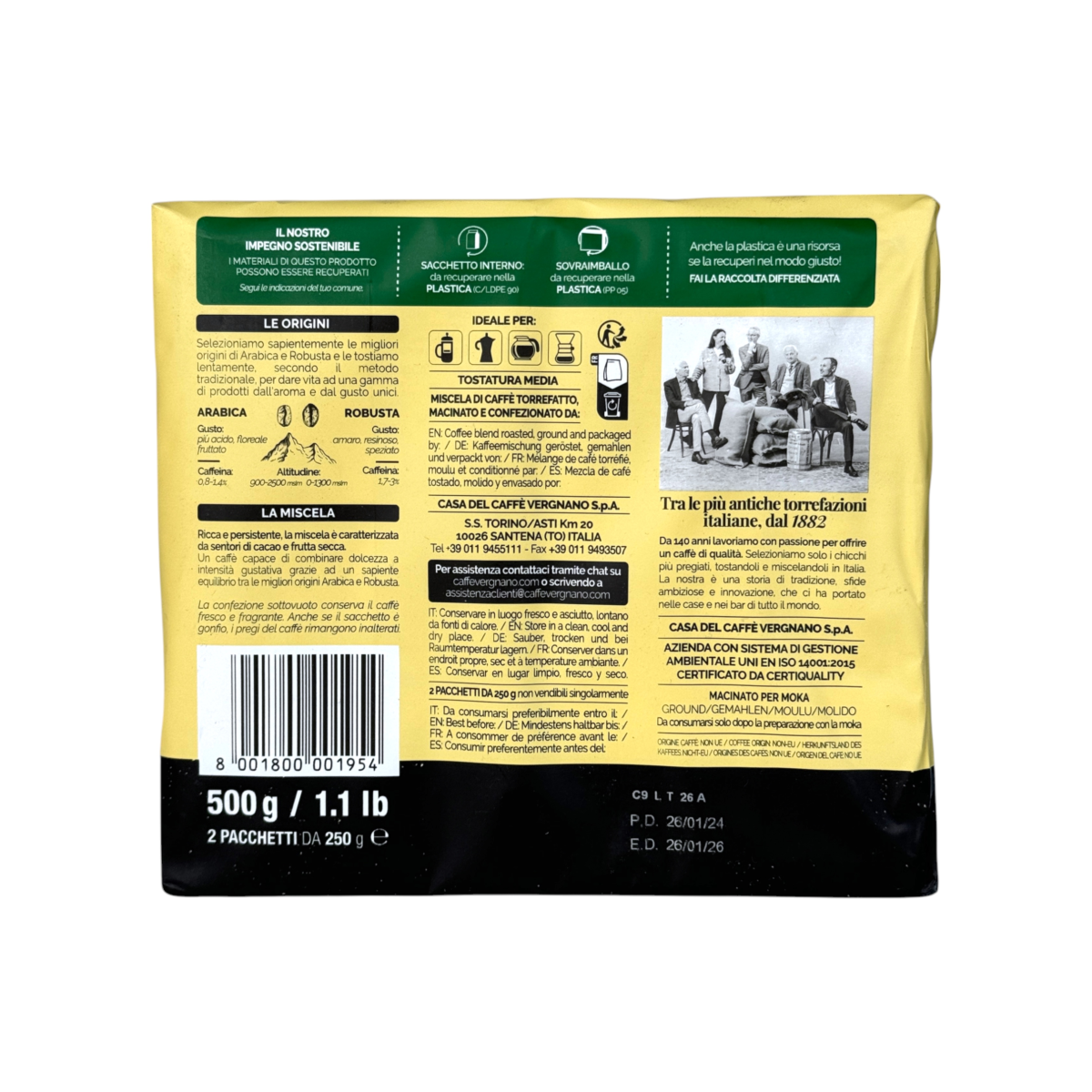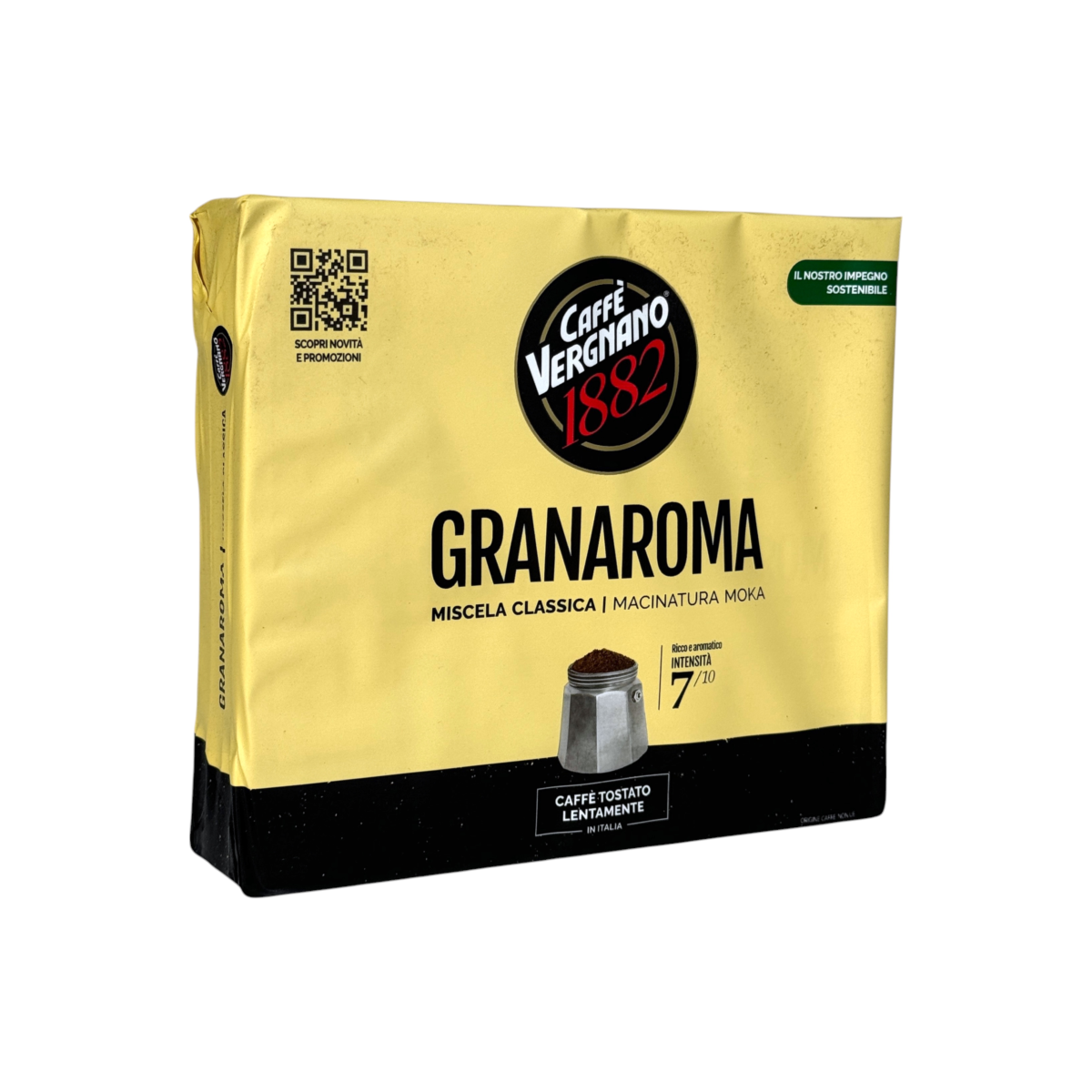 Caffè Vergnano Granaroma — це класична суміш арабіки та робусти, створена для приготування у кавоварках Moka. Завдяки інтенсивності 7/10 та середньому обсмаженню (tostatura lenta e uniforme), кава має збалансований смак із легкими нотами шоколаду та горіхів, помірну гірчинку й оксамитову текстуру. Виготовлена за традиційними італійськими технологіями повільного обсмаження, які зберігають аромат і природну солодкість зерен.