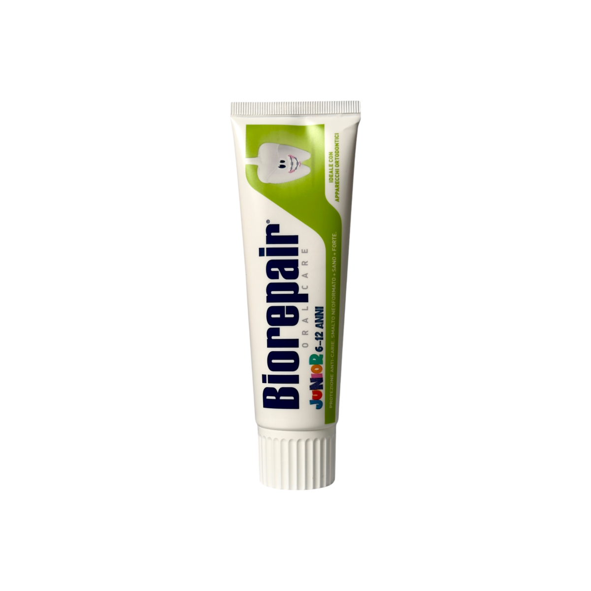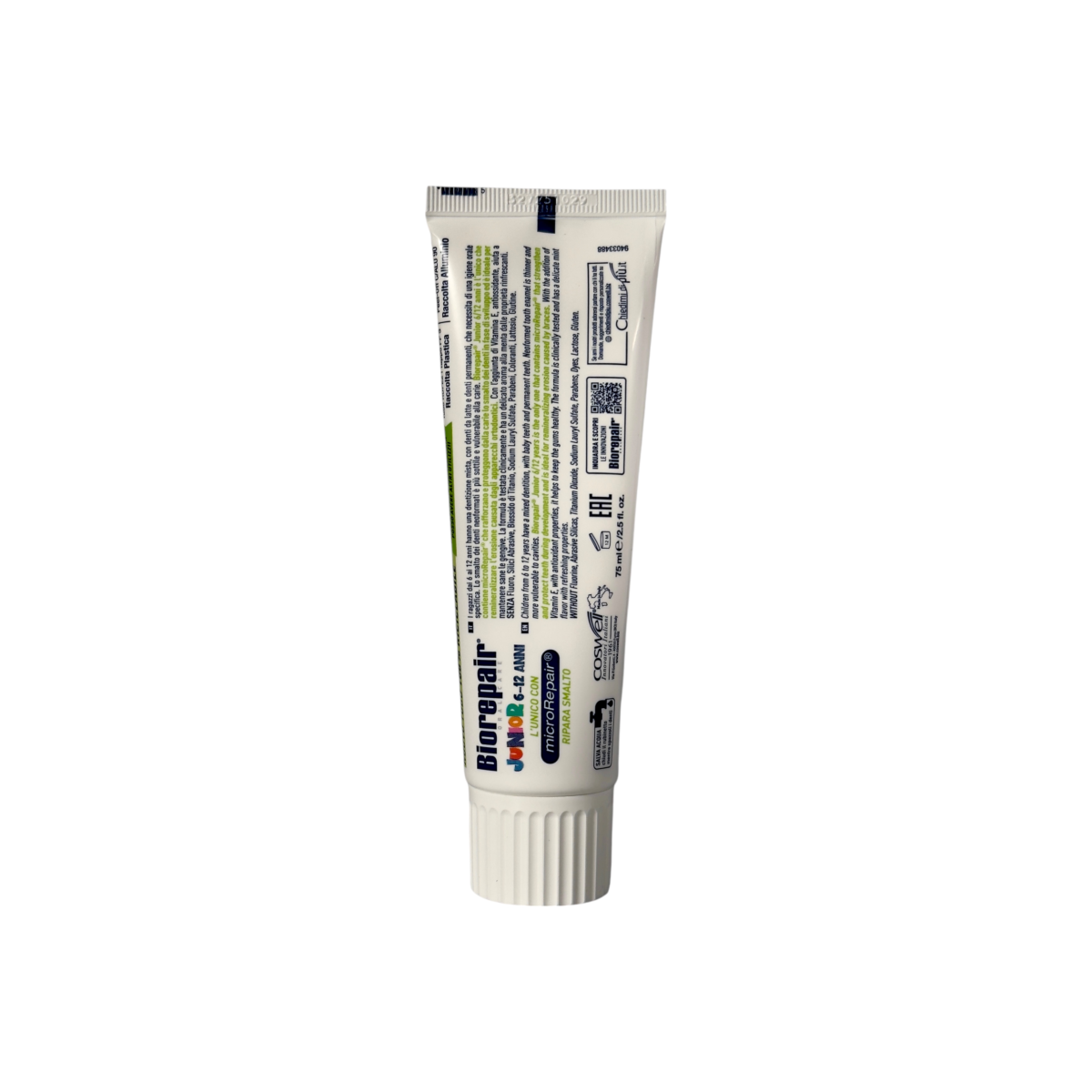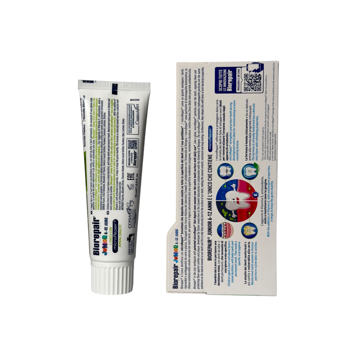 Biorepair Junior 6–12 років — це спеціально розроблена зубна паста для дітей із молочними та постійними зубами. Вона містить унікальну запатентовану формулу microRepair®, яка зміцнює емаль, запобігає карієсу та допомагає відновити пошкодження, викликані кислотами або ортодонтичними брекетами. Паста без фтору, без барвників, із м’яким м’ятним ароматом — делікатна до чутливих ясен і не викликає подразнення. Вироблена в Італії, рекомендована італійськими гігієністами, ця паста є ідеальним вибором для щоденного захисту зубів у період активного формування.