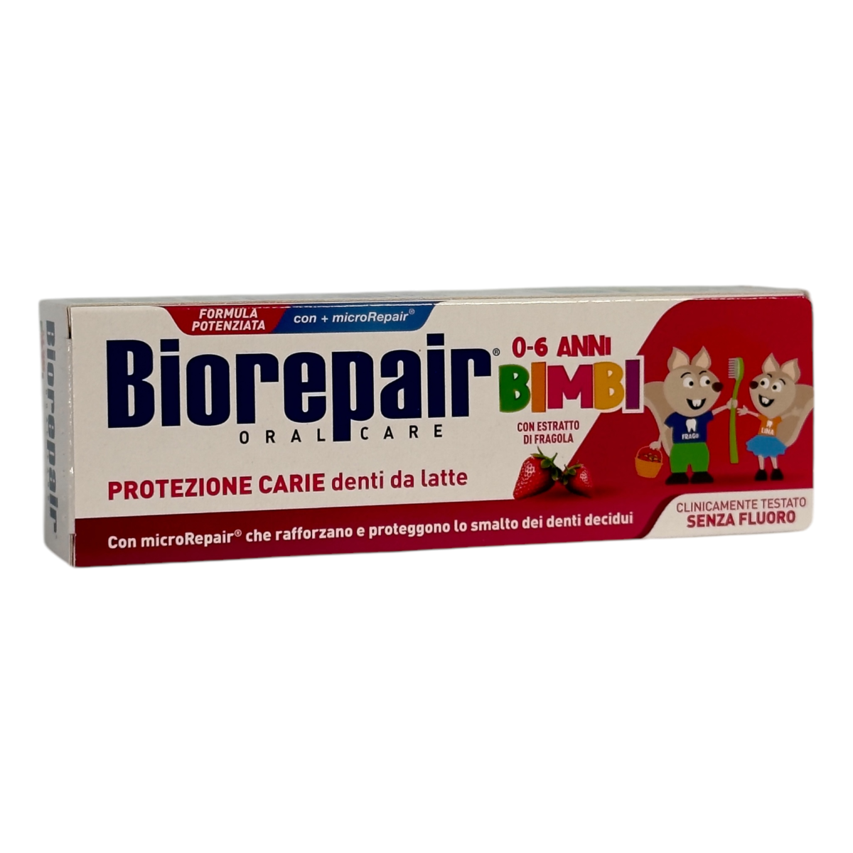 Дитяча зубна паста Biorepair Bimbi захищає молочні зуби від карієсу, відновлює емаль завдяки мінералам microRepair® і має приємний полуничний смак.