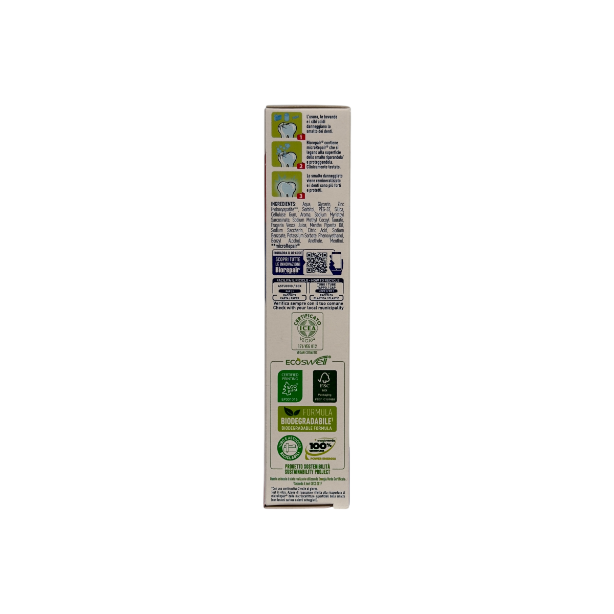 • Склад: microRepair® (гідроксиапатит цинку), вода, гліцерин, кремній, ксиліт, аромат полуниці, без фтору та парабенів