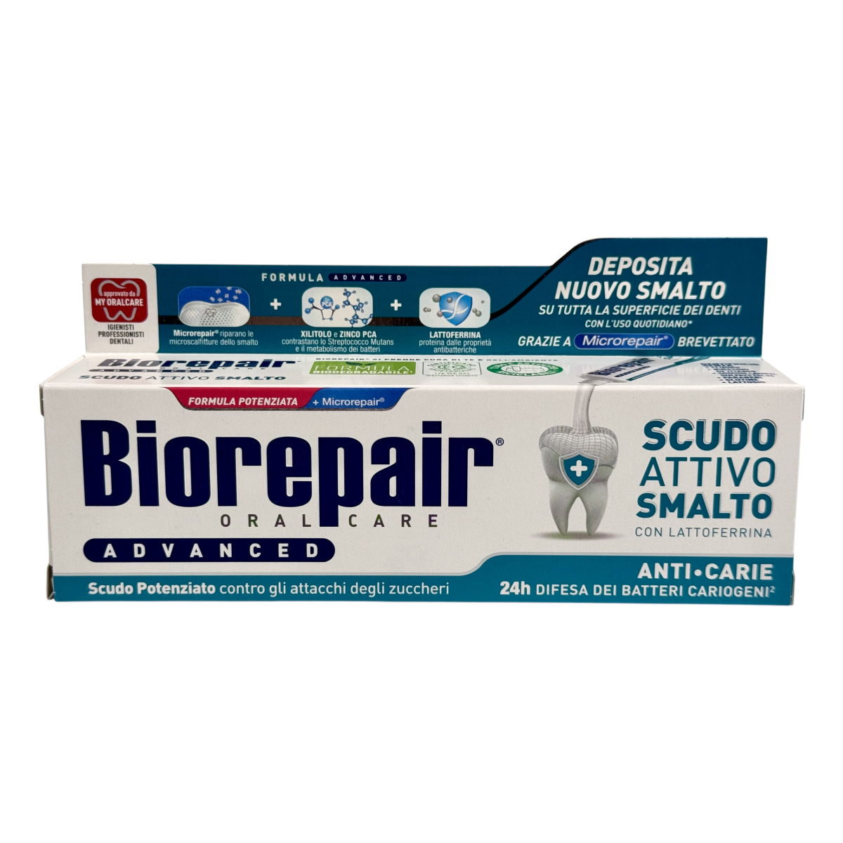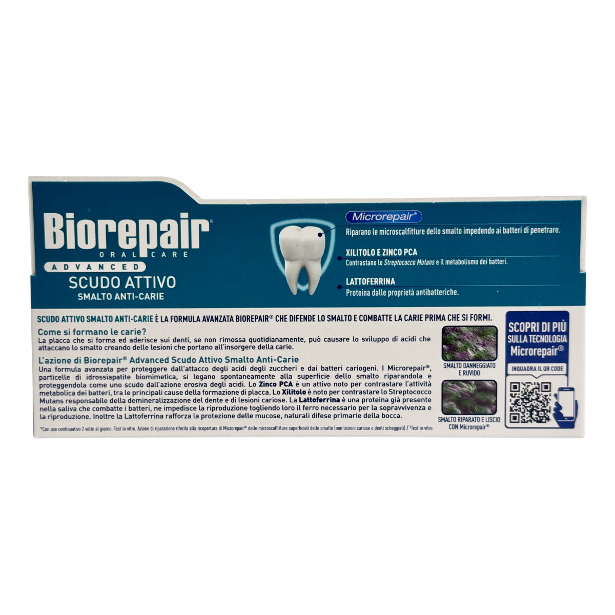 Італійська зубна паста Biorepair Advanced Scudo Attivo Smalto створена для активного захисту емалі та профілактики карієсу.