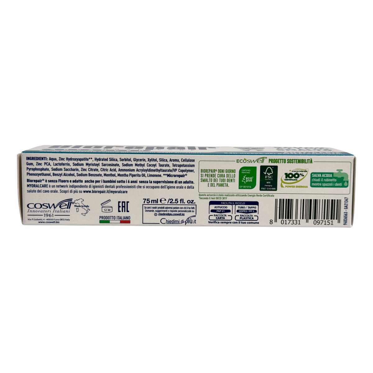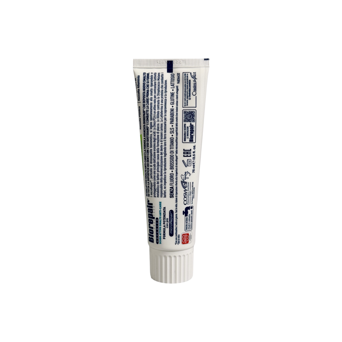 Biorepair — це унікальна формула з мікрочастинками MicroRepair®, які відновлюють мікропошкодження емалі та утворюють захисний бар’єр. Завдяки комбінації цинк PCA, ксилітолу та лактoферину паста не тільки захищає від кислот та бактерій, але й запобігає утворенню карієсу на ранніх стадіях. Підходить для щоденного використання дорослими і дітьми від 6 років. Не містить фтору.