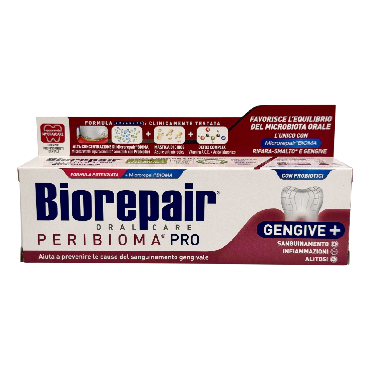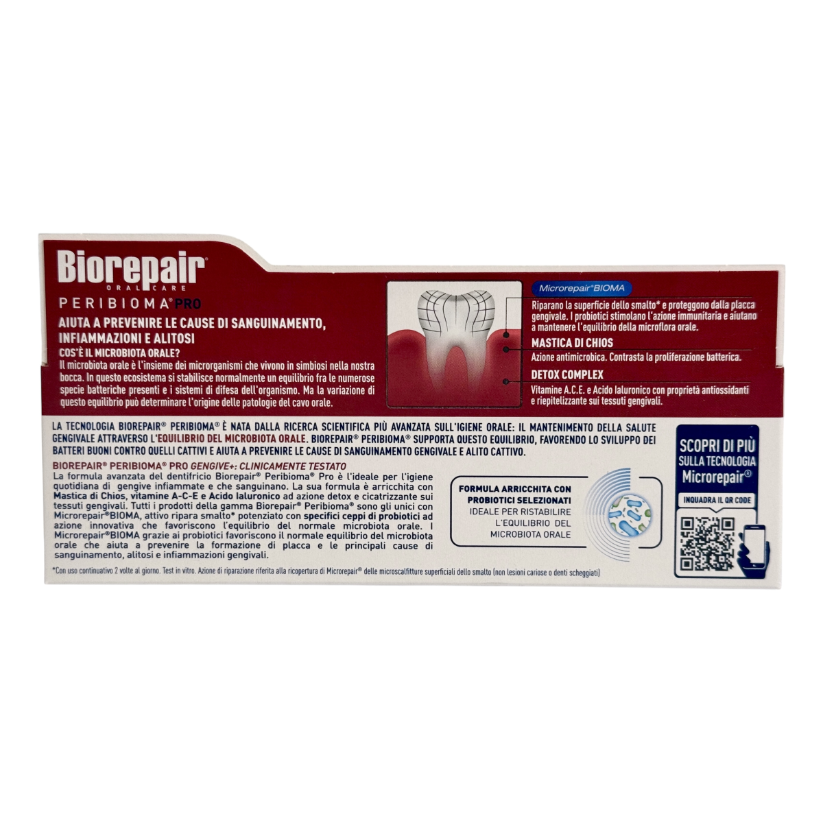 Biorepair Peribioma Pro Gengive+ — інноваційна італійська зубна паста з мікрочастинками Microrepair® BIOMAта пробіотиками, спеціально розроблена для захисту ясен і відновлення емалі.