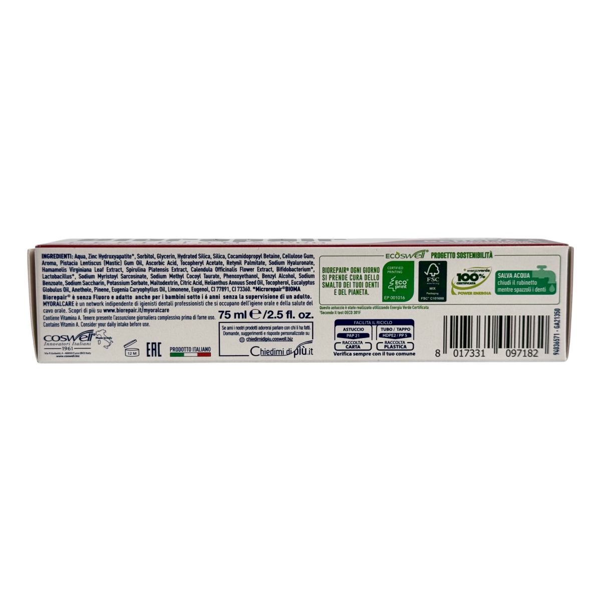 Формула клінічно протестована та збагачена гіалуроновою кислотою, вітамінами A, C, E та натуральною мастикою Хіоса, яка має антимікробну дію. Паста допомагає запобігати кровоточивості, запаленням та неприємному запаху з рота, підтримує баланс орального мікробіому. Biorepair — безфторова паста, безпечна навіть для дітей від 6 років.
