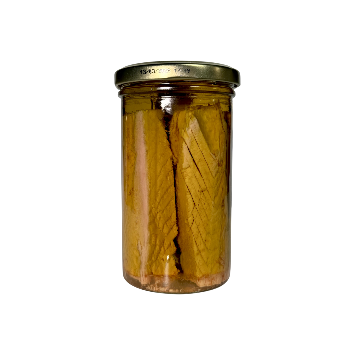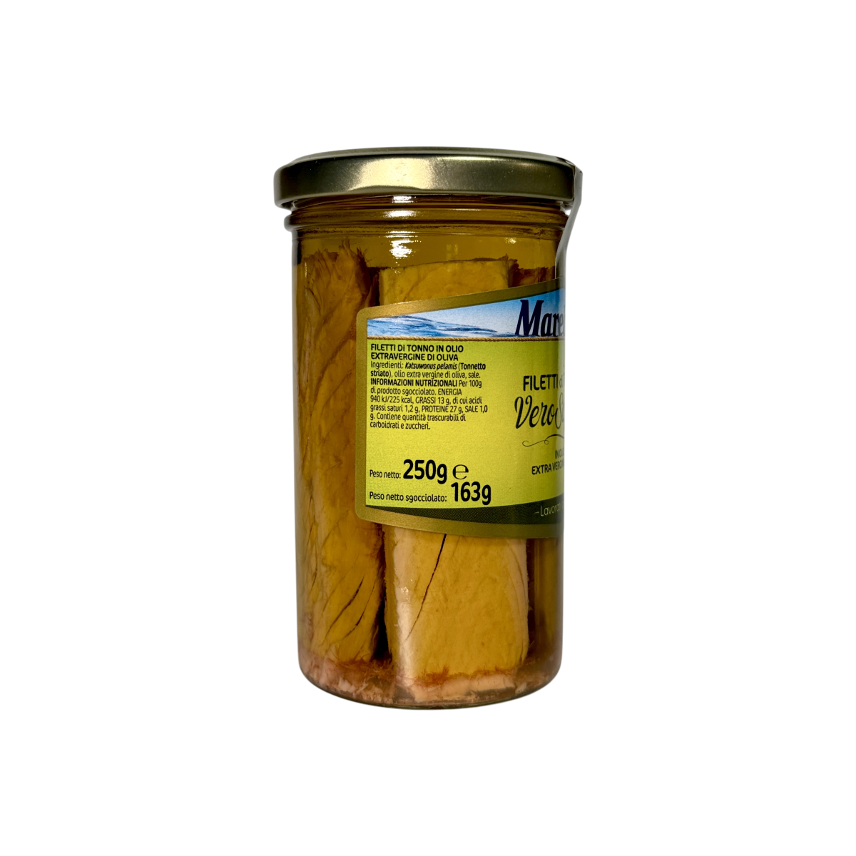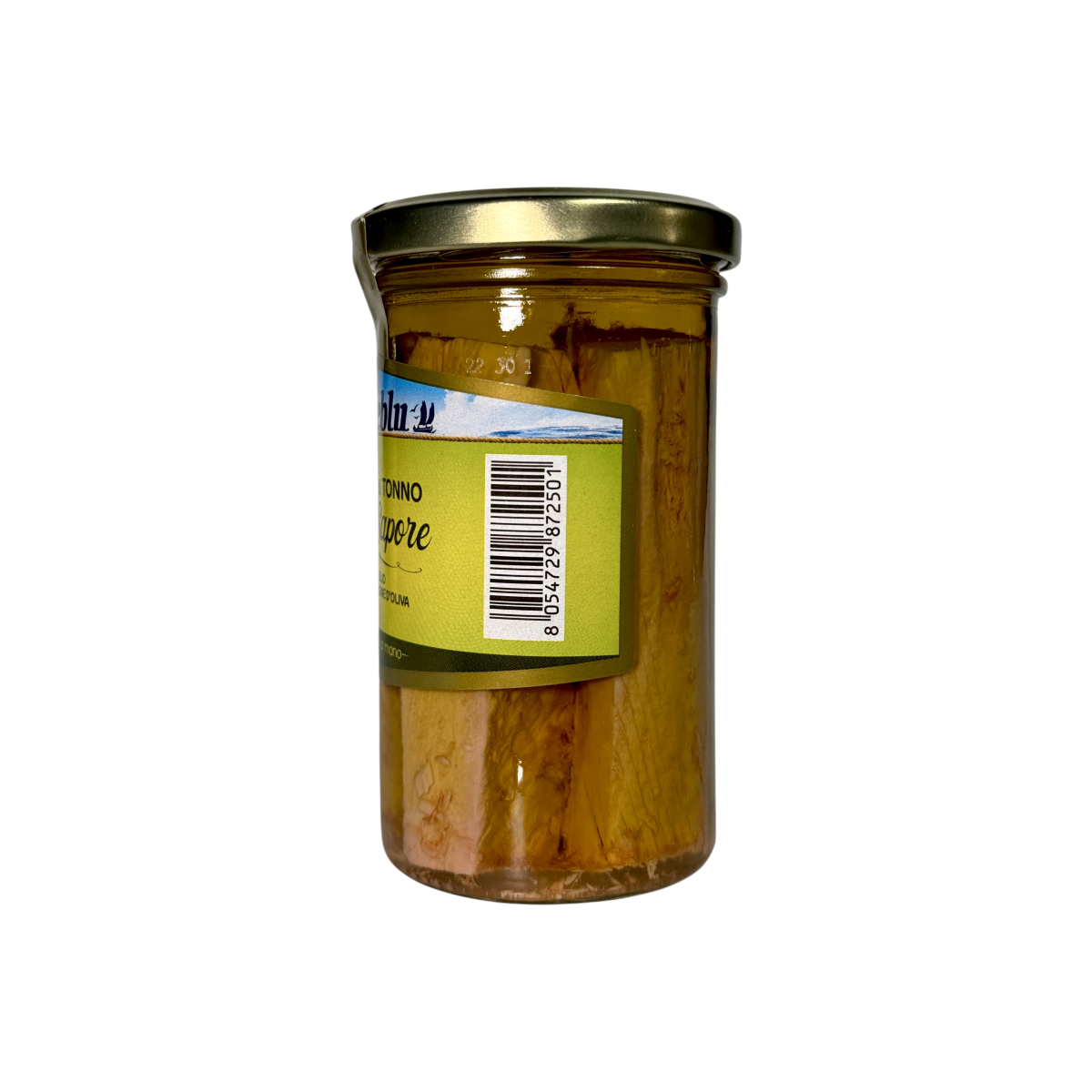 Продукт виготовлений в Італії з тунця Katsuwonus pelamis (тунцець смугастий), відомого своїм м’яким смаком і високим вмістом білка. Ідеально підходить для салатів, паст, брускет або як самостійна страва.
