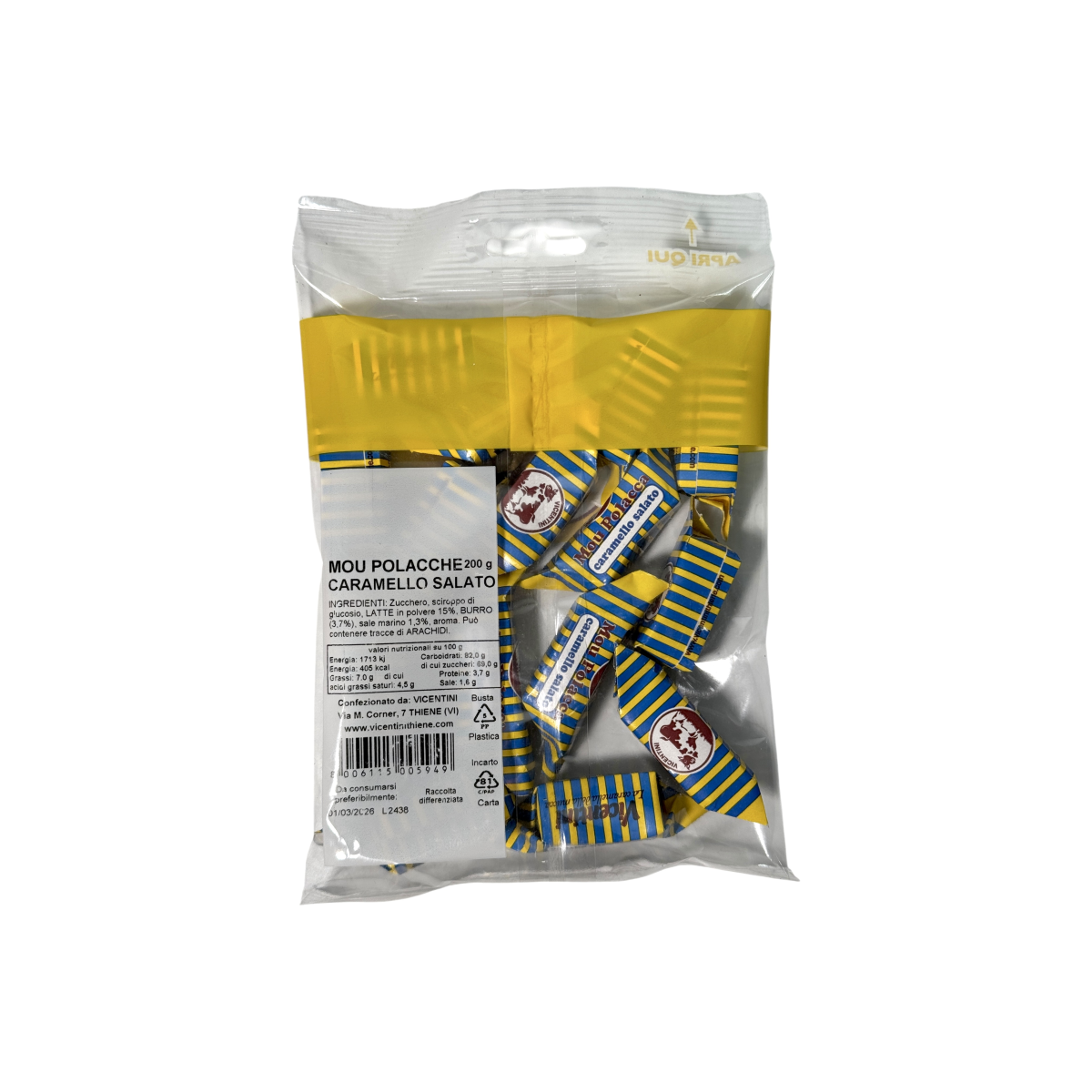 Vicentini Mou Polacche Originali — це класичні м’які італійські цукерки з карамелі з додаванням морської солі, створені за традиційним рецептом із 1950 року. Їхній неповторний смак поєднує ніжну вершковість, солонуваті нотки та м’яку текстуру, що буквально тане у роті.