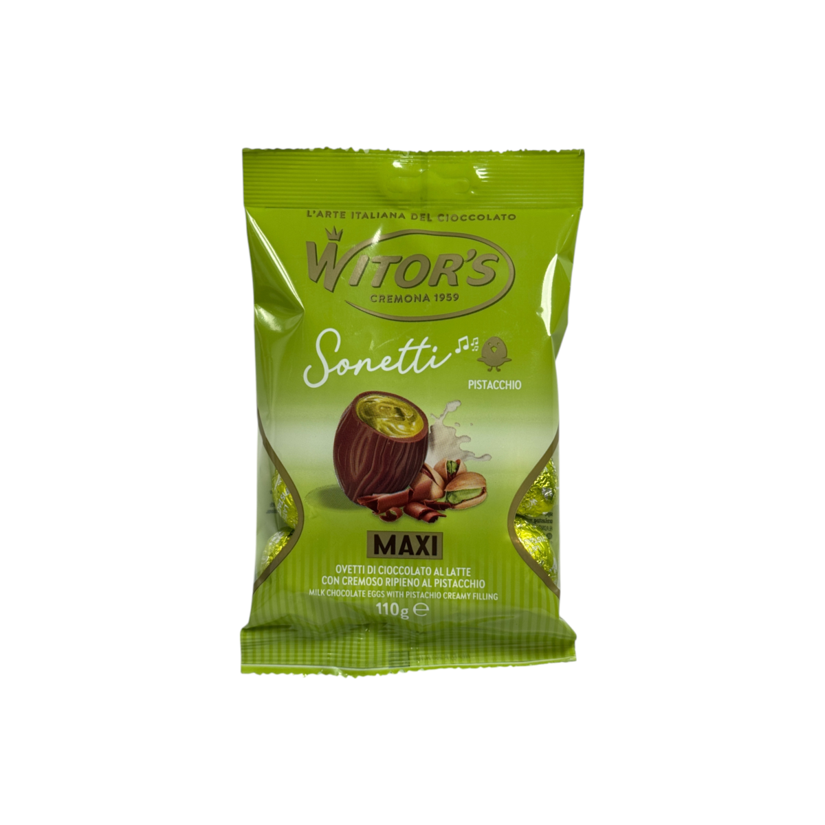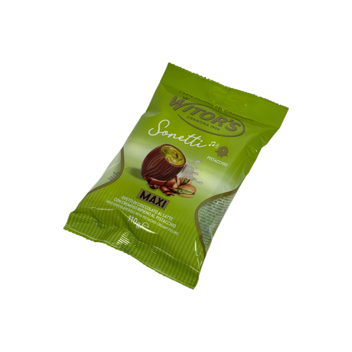 Італійські шоколадні яйця Witor’s Sonetti Pistacchio — це ніжні праліне з молочного шоколаду, наповнені кремовою фісташковою начинкою. Кожне яйце — це маленький шедевр із Кремони, створений італійськими шоколатьє з 1959 року.
