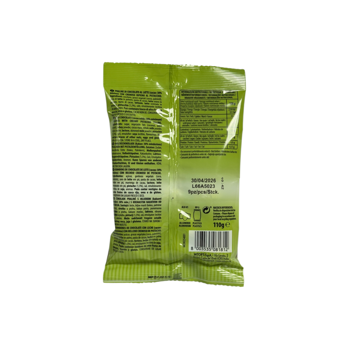 • Склад: цукор, какао-масло, какао-паста, сухе молоко, фісташкова паста, рослинні жири, емульгатор (соєвий лецитин), ароматизатори. Може містити сліди інших горіхів.