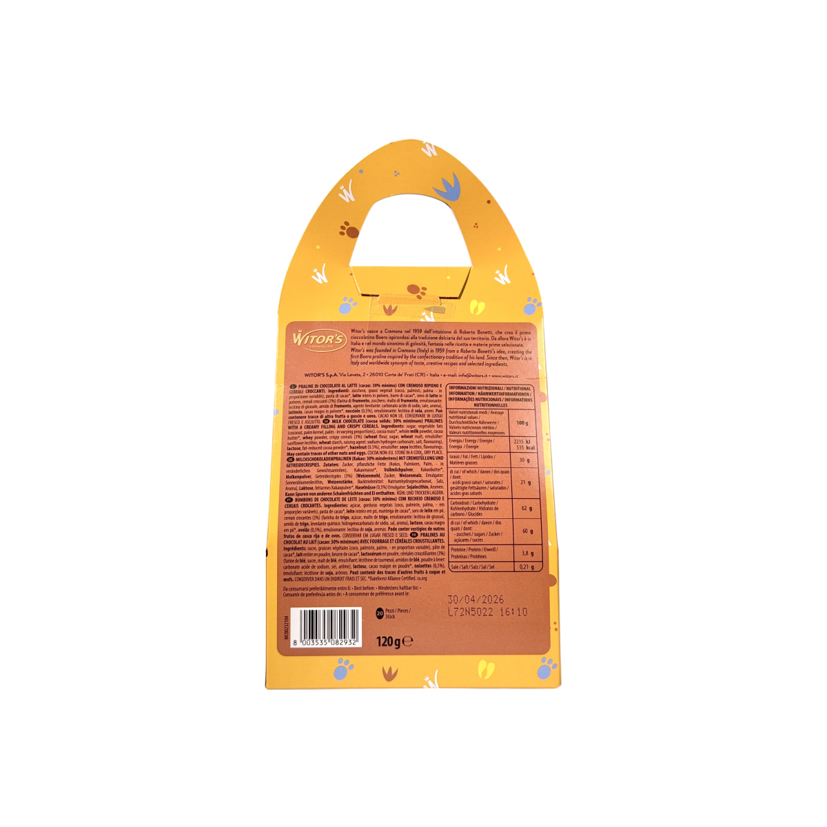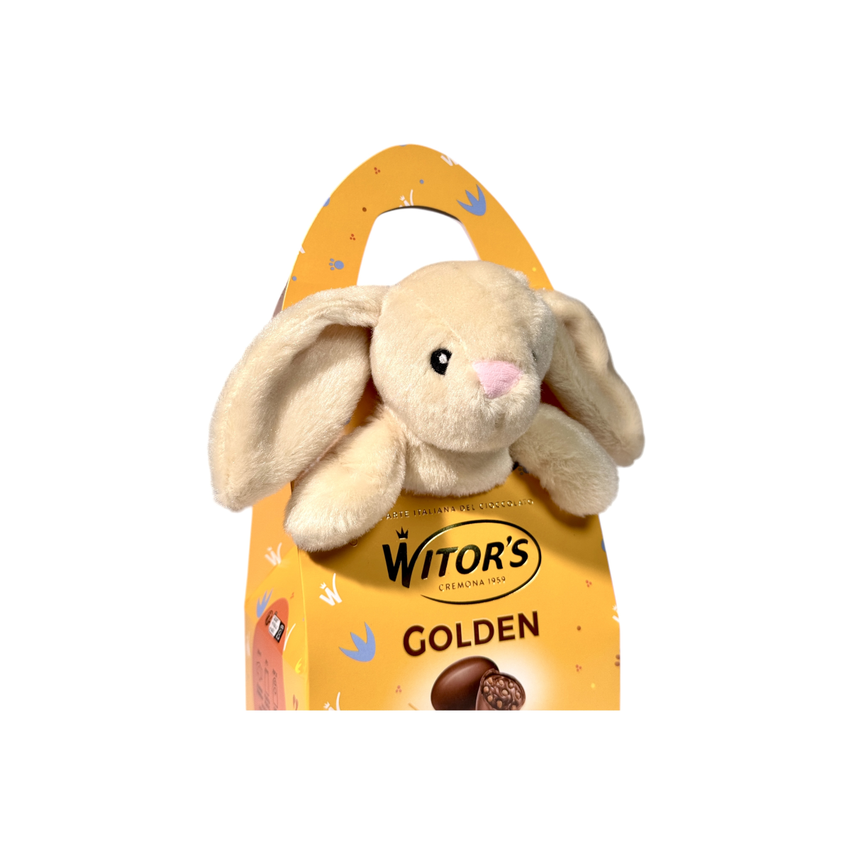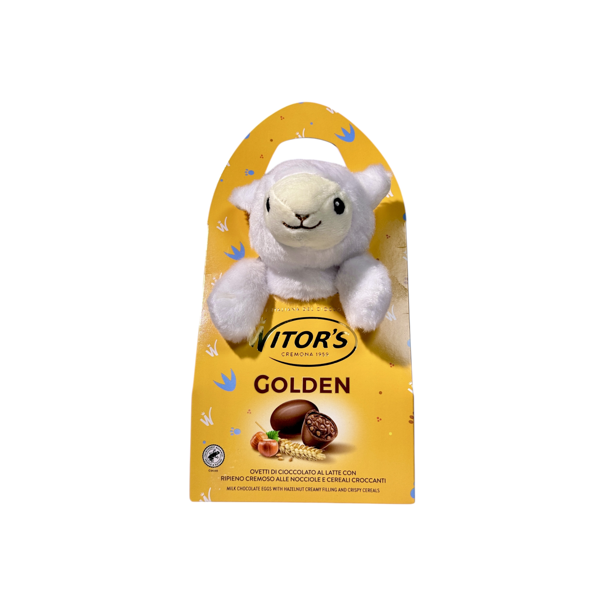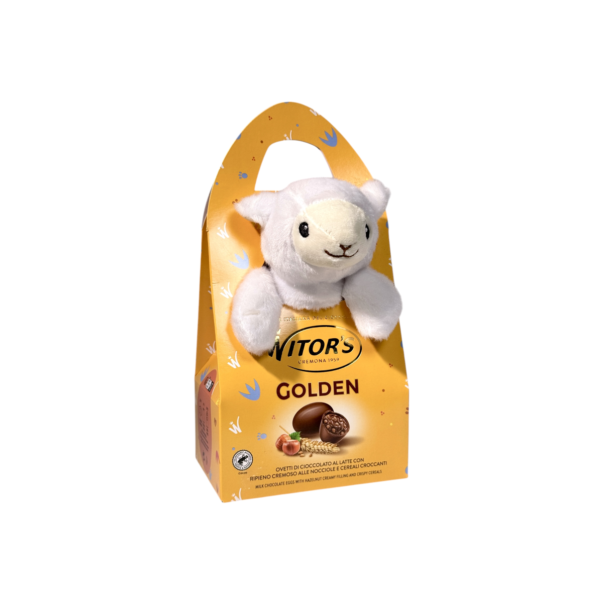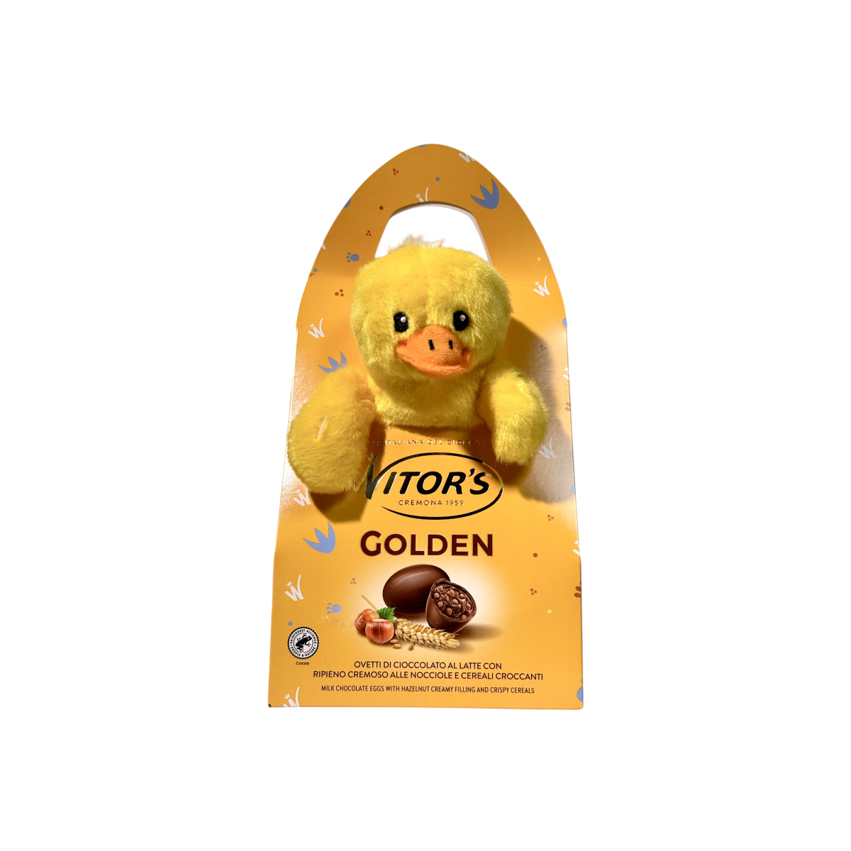 Відчуйте італійську якість із шоколадом Witor’s Golden, створеним у Кремоні з 1959 року. Кожне яйце — це поєднання ніжного молочного шоколаду та ароматної начинки з фундука, доповнене хрусткими злаками. Ідеально підходить як великодній або святковий подарунок для дітей і дорослих. У комплекті — м’яка іграшка-зайчик, що додає чарівності та радості. Продукт виготовлено в Італії з високоякісних інгредієнтів без ГМО.