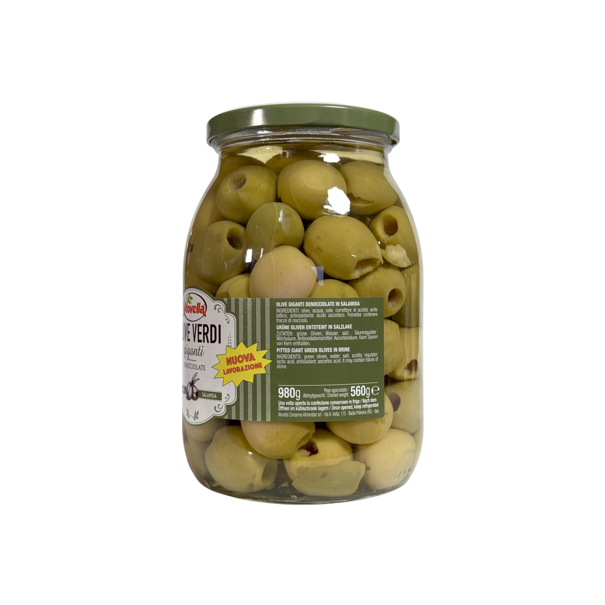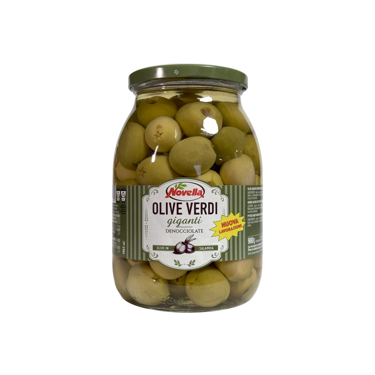 Великі зелені оливки Novella giganti — це соковиті, м’ясисті оливки без кісточки, приготовані у ніжному розсолі для збереження природного смаку та аромату Італії.