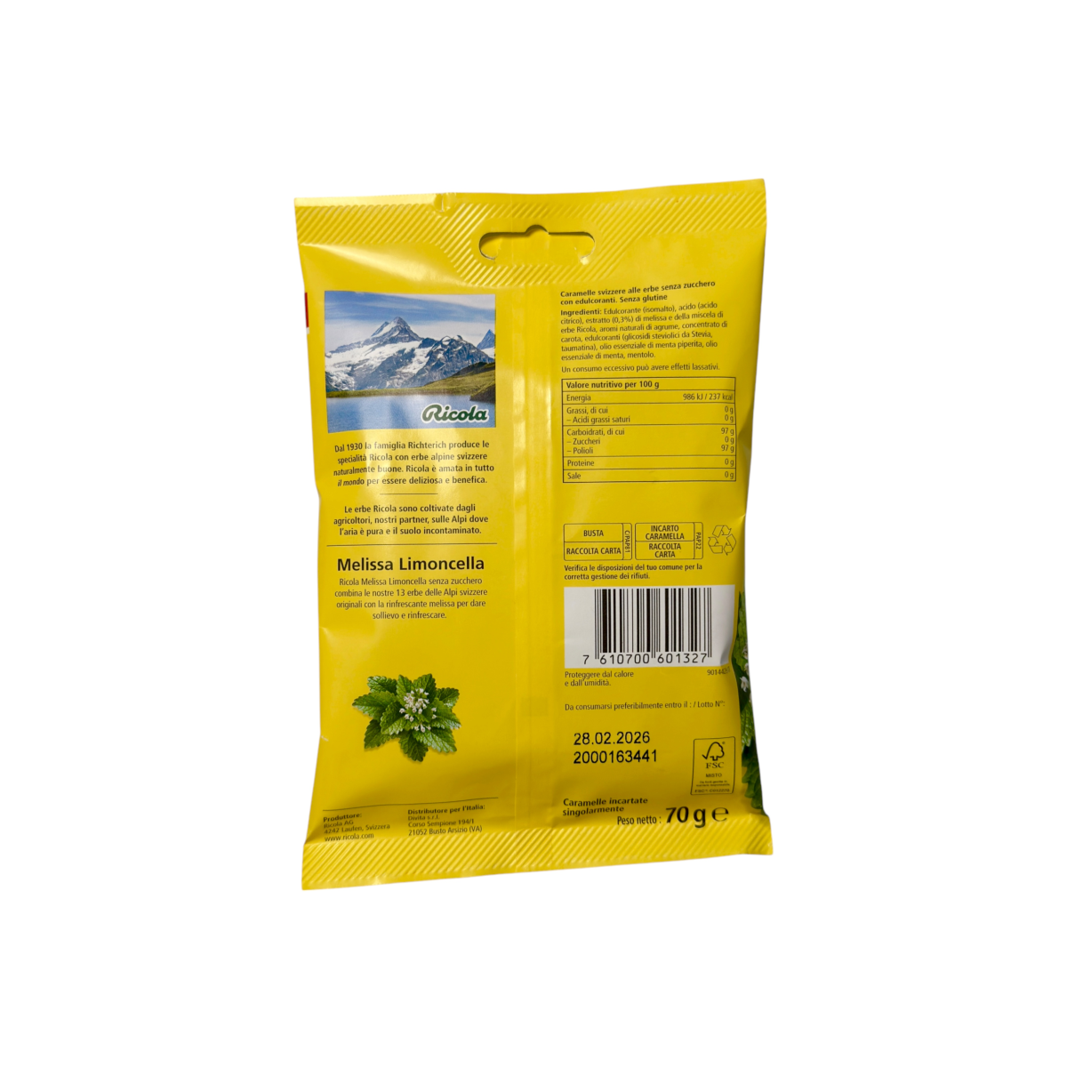 Льодяники швейцарські Ricola меліса та лімонник без цукру melissa limoncella senza zucchero, 70 г