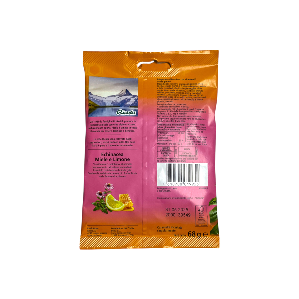 Виготовлені з трав Альп за традиційним рецептом Ricola, ці льодяники поєднують дію ехінацеї, меду та лимона, забезпечуючи природний захист організму та приємне відчуття свіжості. Ricola — це легендарний бренд із Швейцарії, відомий з 1930 року своєю високою якістю та чистими інгредієнтами. Продукт містить вітамін С, який підтримує імунну систему, а також допомагає заспокоїти подразнене горло. Ідеальний вибір у холодну пору року або під час підвищеного навантаження на голос.