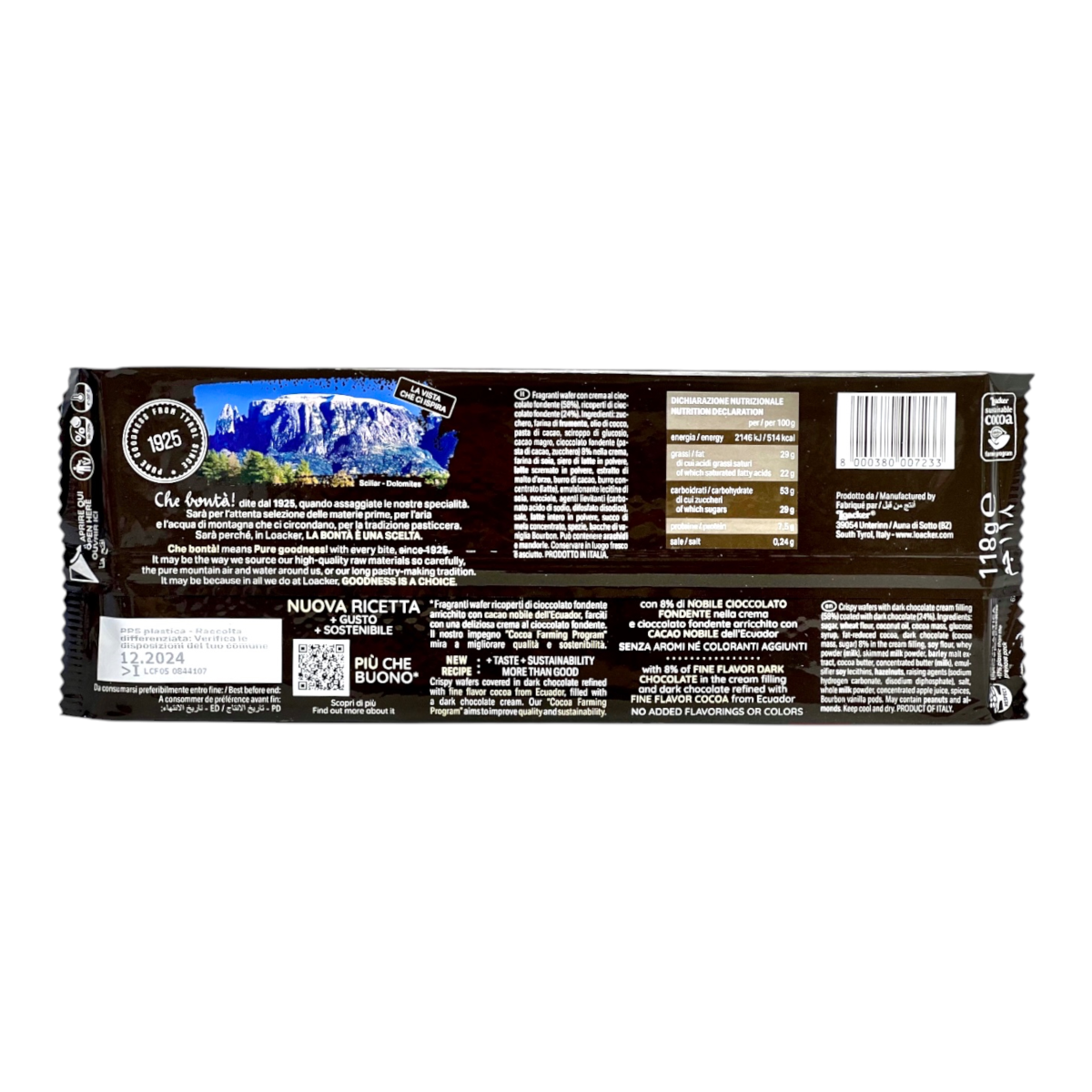 Вафлі Loacker з шоколадним кремом у чорному шоколаді chocolat fondente, 118 г
