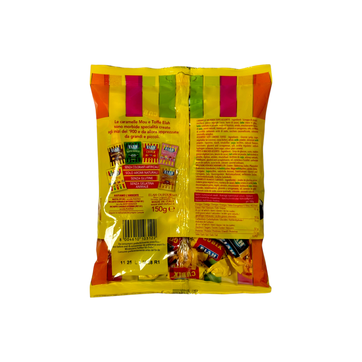 Італійські м’які іриски Elah Assortite — асорті ніжних молочних та карамельних цукерок без желатину, глютену та штучних барвників.