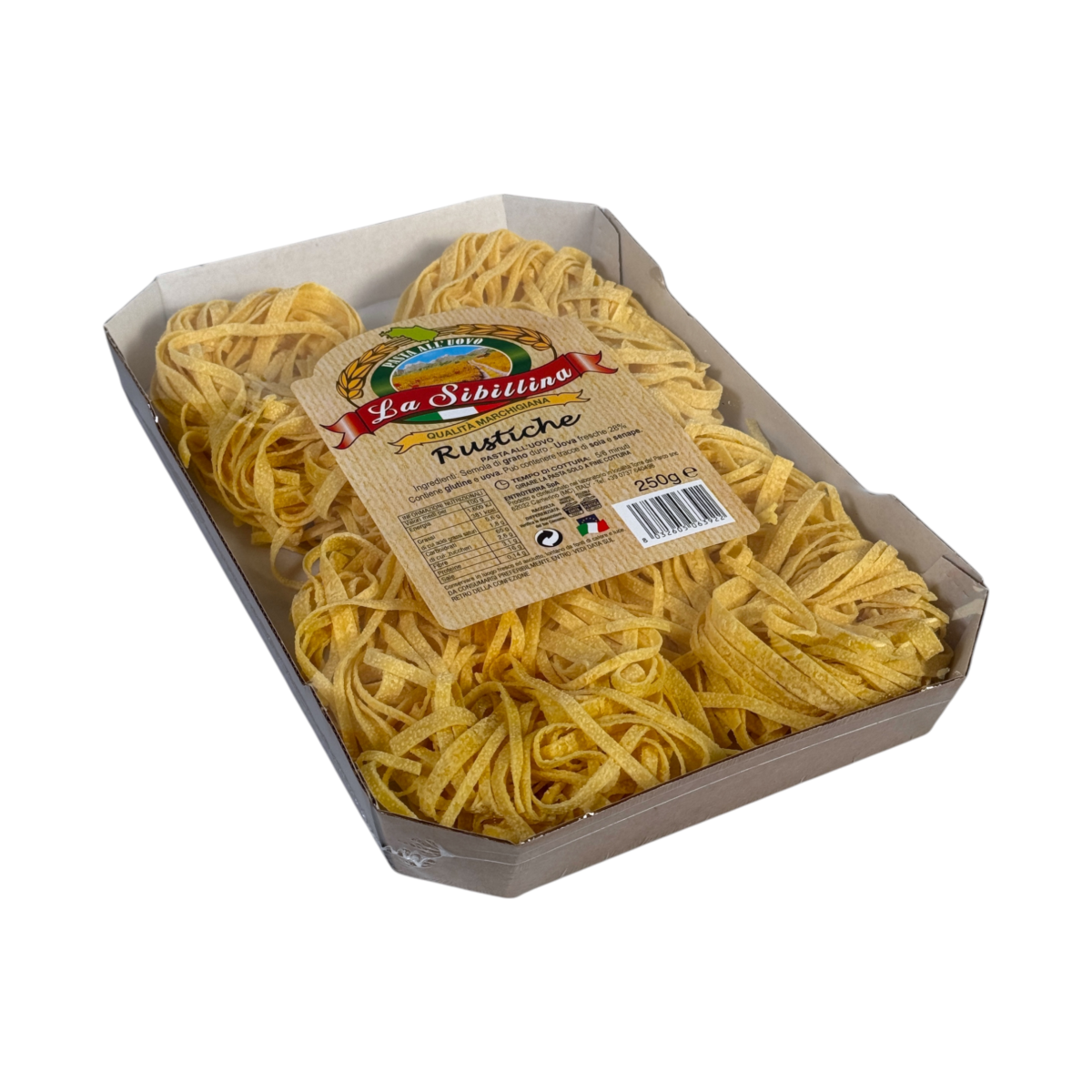 Справжній смак Італії — з регіону Марке! Паста La Sibillina Rustiche виготовлена за традиційним рецептом із твердих сортів пшениці з додаванням 28% свіжих яєць. Завдяки грубішій текстурі, вона чудово вбирає соуси та надає стравам домашнього, автентичного смаку. Ідеальна для поєднання з м’ясними, грибними чи вершковими соусами. Продукт створено в Італії для внутрішнього ринку, без додатків консервантів чи барвників. Ми напряму працюємо з італійськими виробниками, тому гарантуємо — 100% оригінал і найвища якість.