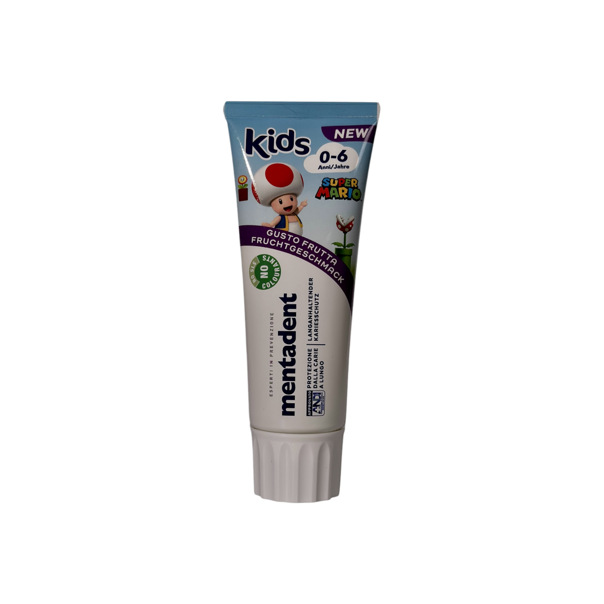 Mentadent Kids Super Mario — це італійська зубна паста, розроблена з урахуванням особливостей дитячої емалі. Вона м’яко очищує, запобігає появі карієсу та зміцнює зуби. Містить оптимальну кількість фтору (500 ppm), що забезпечує ефективний, але безпечний захист. Без барвників і агресивних компонентів, має ніжний фруктовий смак, який діти полюбляють. Веселий дизайн із героями Super Mario заохочує дітей чистити зуби щодня.