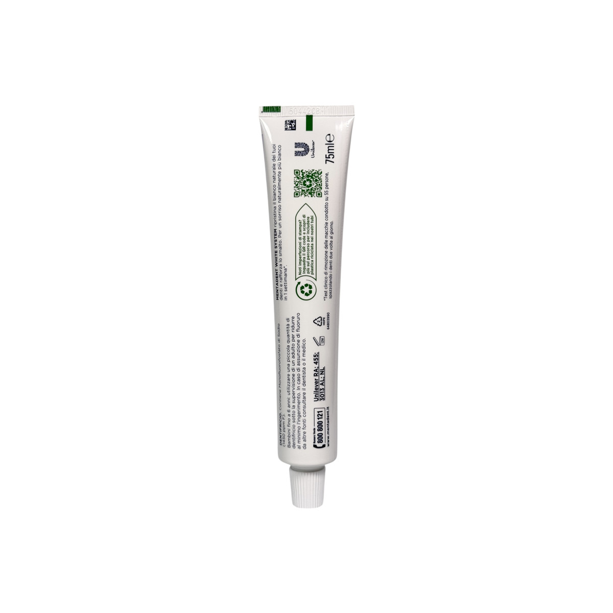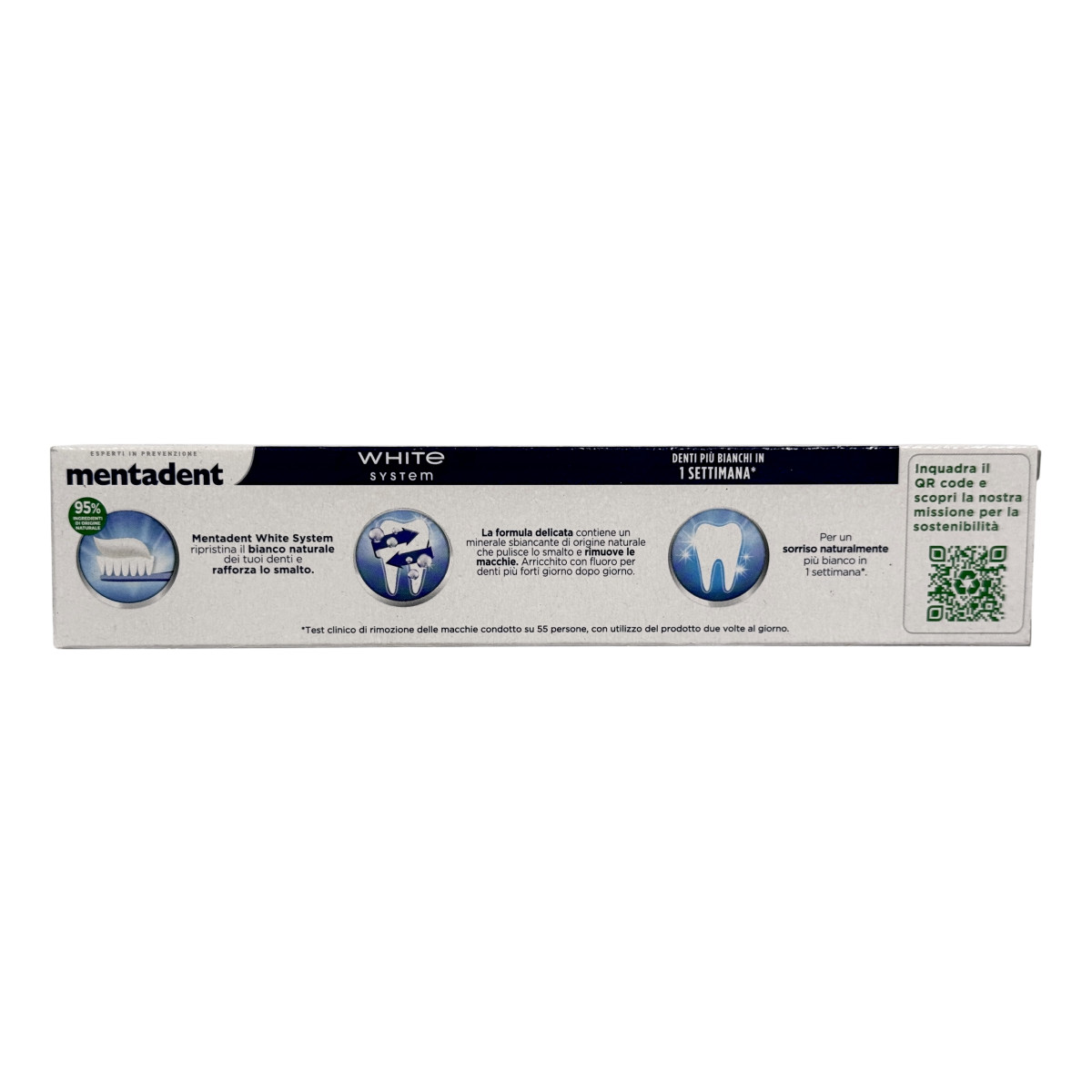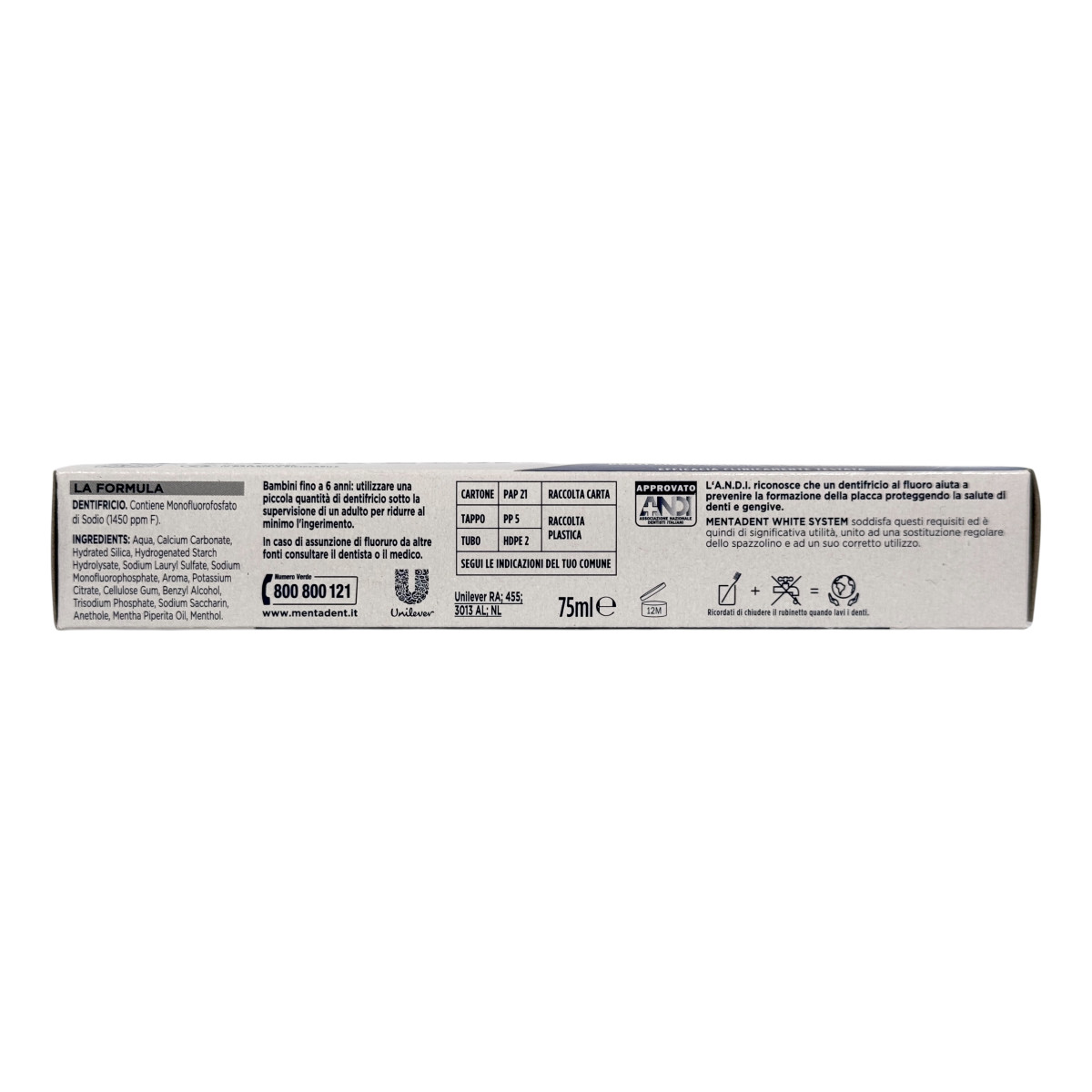 Розроблена італійськими експертами Mentadent (Unilever Italy), паста містить фтор (1450 ppm) для зміцнення емалі та м’які полірувальні мікрочастинки, які видаляють плями від кави, чаю та вина. Формула з ментолом забезпечує тривале відчуття свіжості. Паста схвалена Італійською асоціацією стоматологів (A.N.D.I.) та підходить для щоденного використання.