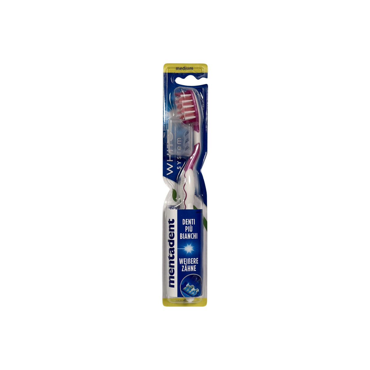 Зубна щітка Mentadent White System Medium — це ефективна щітка для щоденного догляду, створена для м’якого полірування зубів і підтримання їх природної білизни.