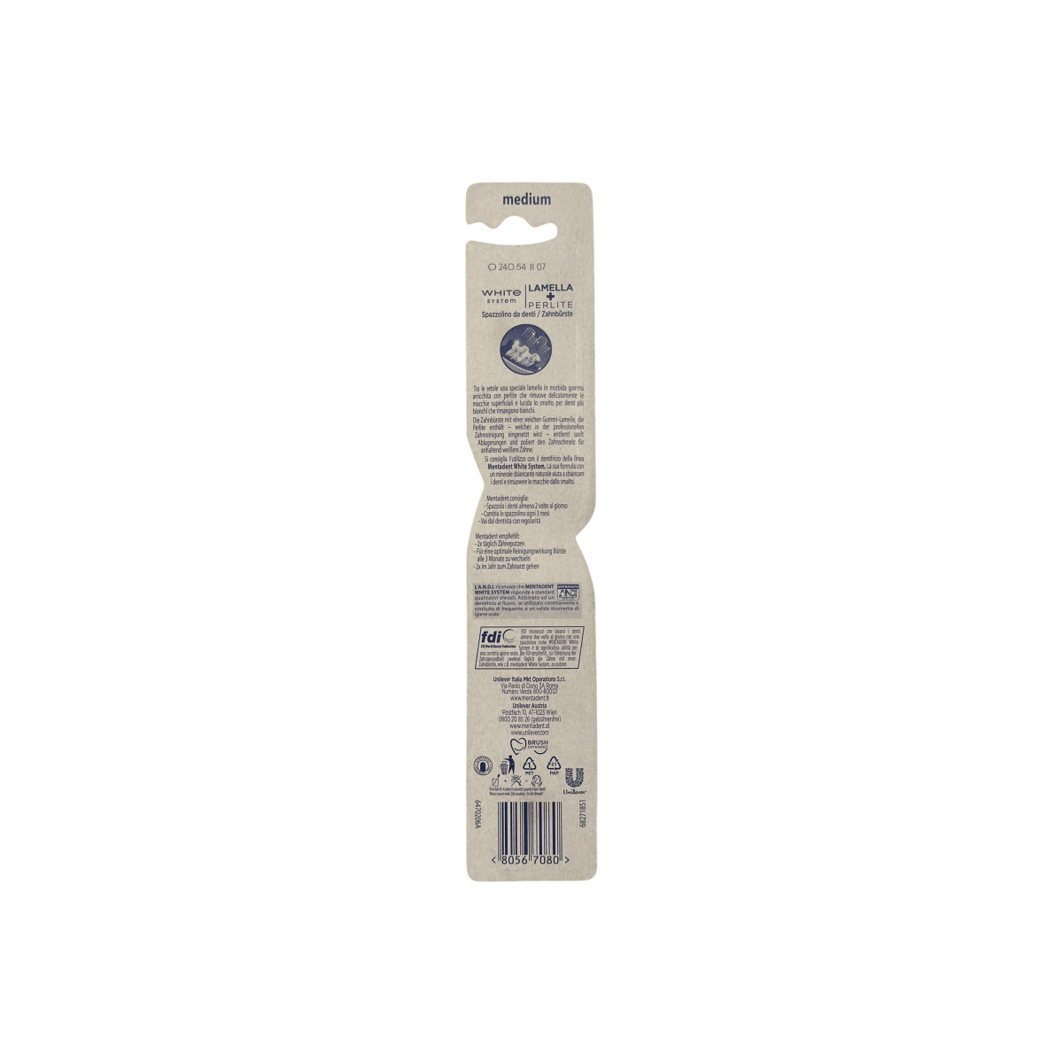 Бренд Mentadent (Unilever Italy) розробив унікальну систему White Lamella System — спеціальні вставки з мікрогранулами перліту, які делікатно полірують емаль, не пошкоджуючи її. Щетинки середньої жорсткості видаляють наліт навіть у важкодоступних місцях, забезпечуючи глибоке очищення та свіжість. У комплект входить гігієнічний ковпачок, а ергономічна ручка гарантує комфортне користування.