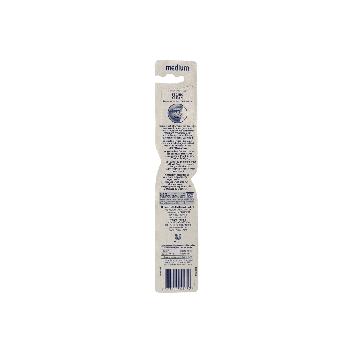 Бренд Mentadent (Unilever Italy) створив цю модель із урахуванням ергономіки та потреб сучасної гігієни ротової порожнини. Щітка оснащена спеціально вигнутими щетинками середньої жорсткості, які м’яко, але ефективно видаляють наліт, не пошкоджуючи ясна. Завдяки зручній ручці з антиковзним покриттям та очищувачу язика на звороті головки, Mentadent Tecnic Clean забезпечує повноцінне очищення рота та свіжість подиху щодня.
