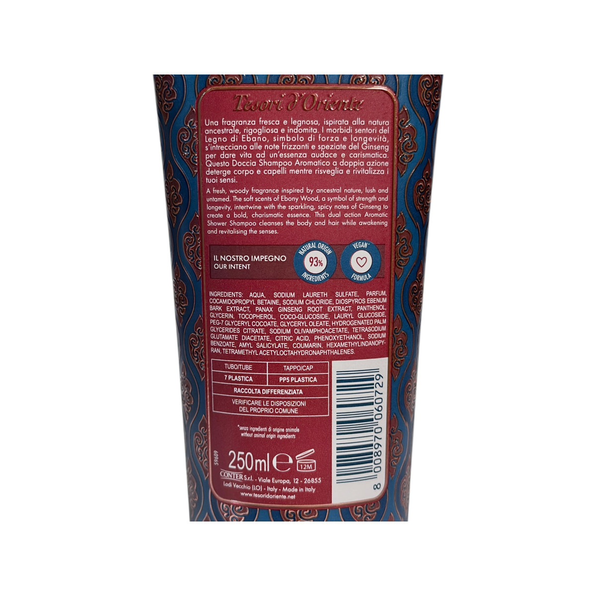 Tesori d’Oriente For Men — це італійський засіб 2-в-1, який дарує свіжість і силу. Його формула з 93% інгредієнтів натурального походження очищає шкіру та волосся, залишаючи після себе стійкий, харизматичний аромат. Ебенове дерево символізує міцність та витривалість, а женьшень додає тонусу та бадьорості. Веганська формула без тестів на тваринах робить цей продукт відмінним вибором для сучасних чоловіків.
