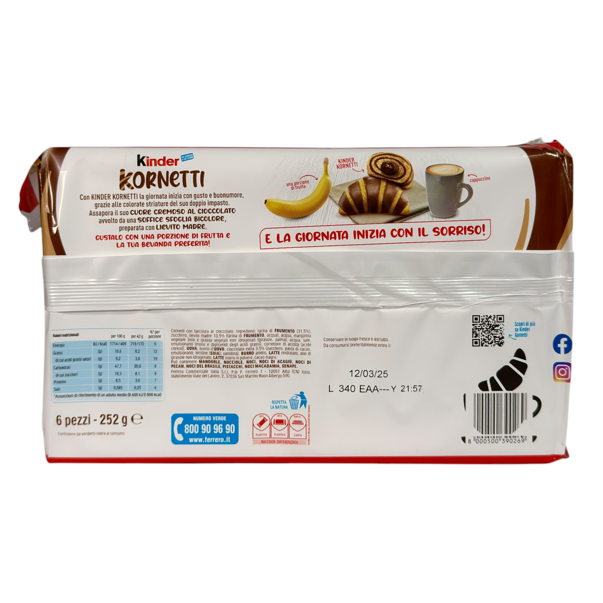 Почніть свій день зі смачного ранку з Kinder Kornetti Cioccolato — ароматними біколорними круасанами з м’яким серцем із шоколадного крему. Створені на основі натуральної закваски (lievito madre), вони дарують ніжну текстуру та збалансований смак, властивий найкращим італійським виробам. Зручно брати з собою в дорогу, на навчання або роботу. Виготовлено в Італії компанією Ferrero — гарантія якості та насолоди.