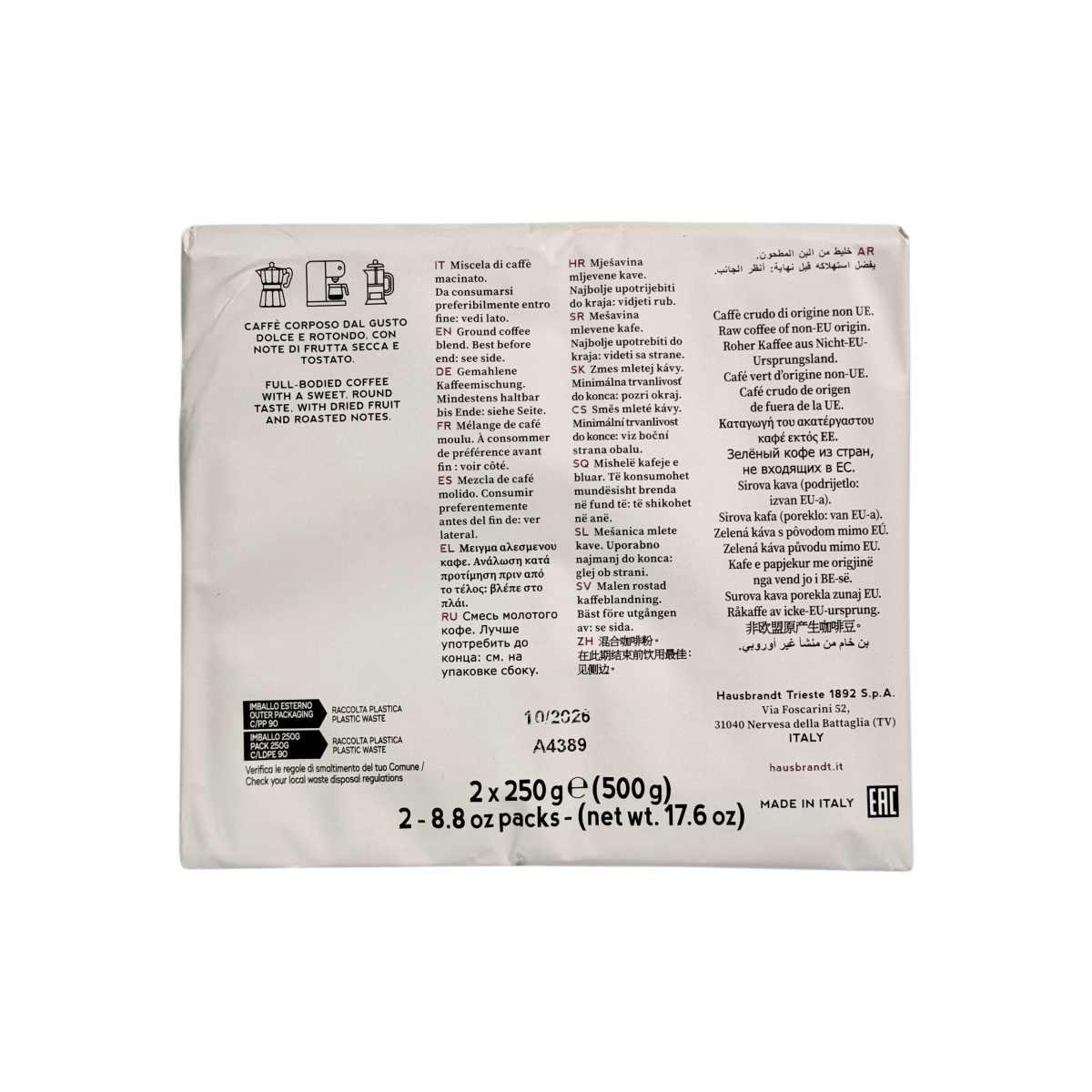Ця кава ідеально підходить для приготування ароматного еспресо, капучино або латте, даруючи щільну кремову пінку та м’який післясмак. Завдяки досвіду обсмаження Hausbrandt Trieste 1892, кожна чашка розкриває глибину аромату справжньої італійської кави.