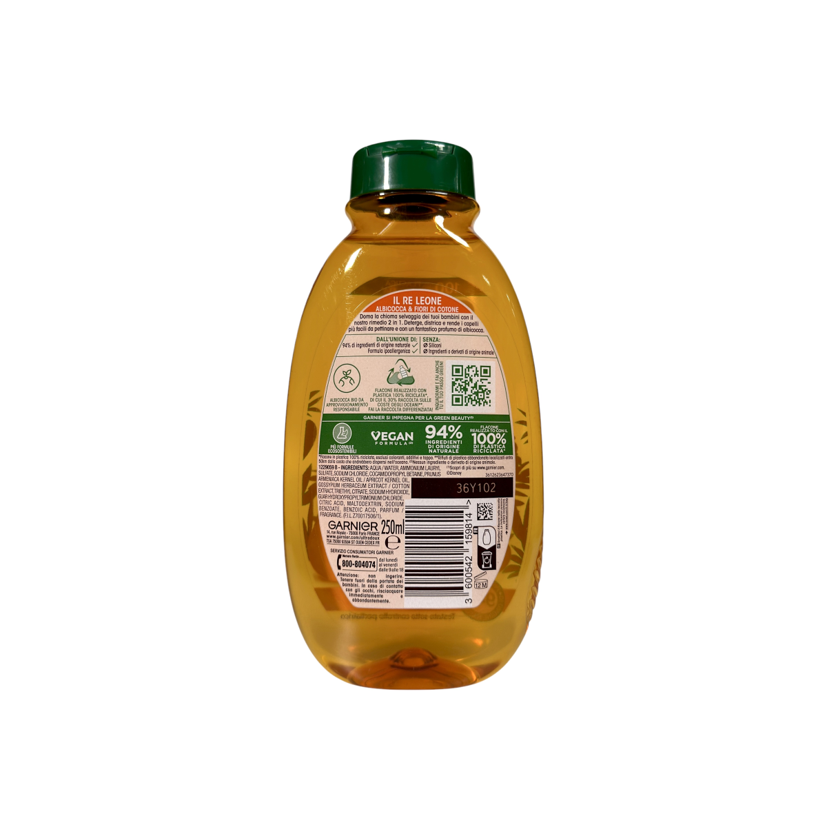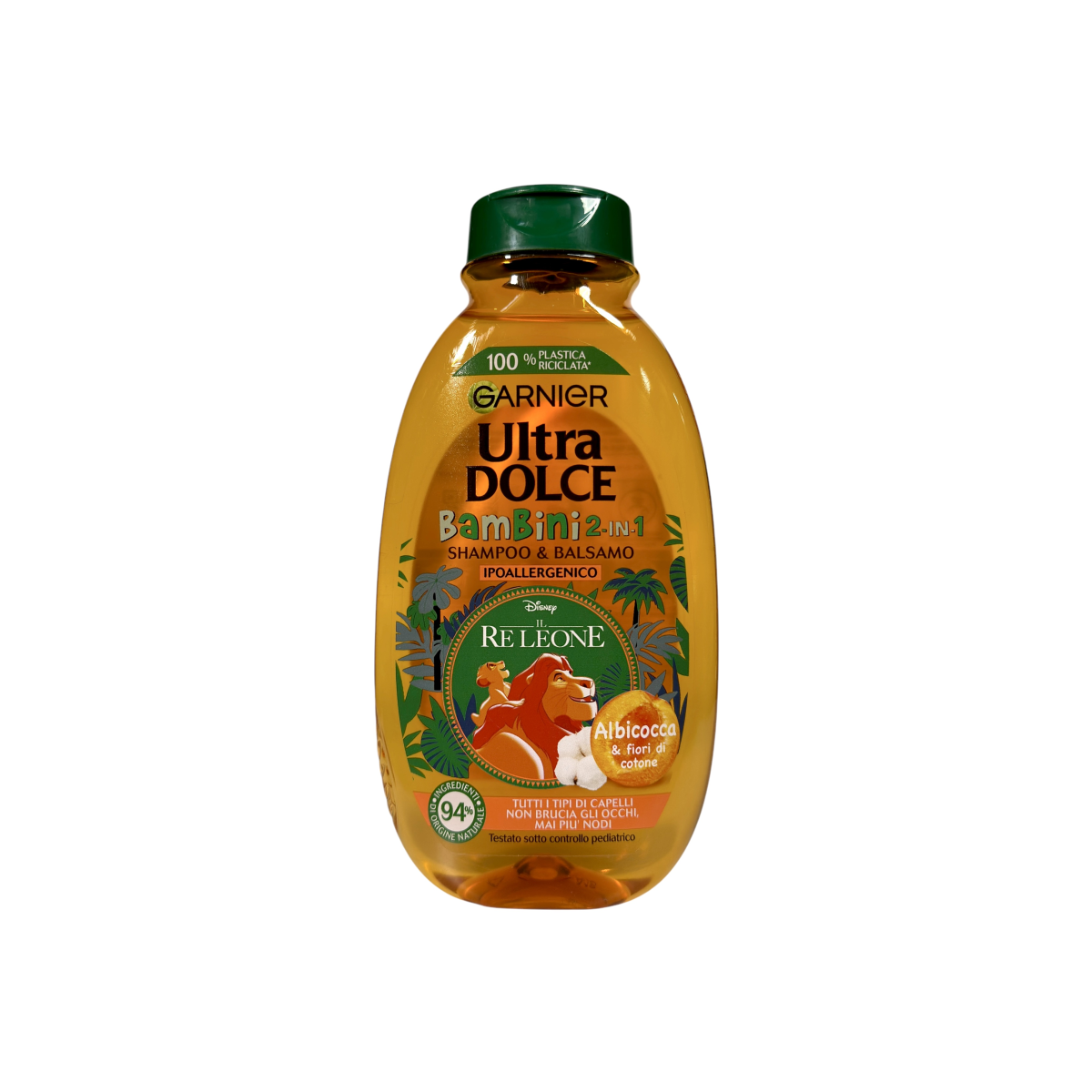 Формула з екстрактом абрикоса та квітів бавовни дбайливо очищає та живить дитяче волосся, роблячи його м’яким і блискучим. Засіб гіпоалергенний, протестований під педіатричним контролем, не подразнює очі та підходить для щоденного використання. Garnier Ultra Dolce Bambini містить 95% інгредієнтів натурального походження, vegan formula та упаковку з переробленого пластику — екологічний вибір для родини.