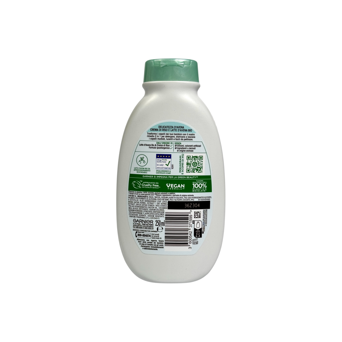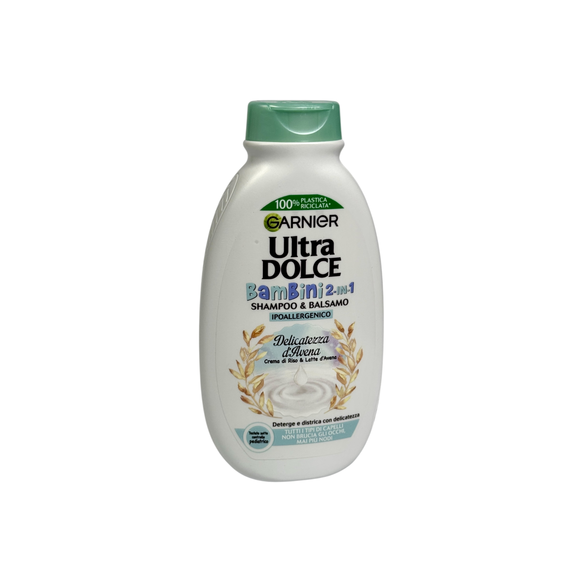 Подаруйте дитячому волоссю природну ніжність з шампунем Garnier Ultra Dolce Bambini. Формула з органічним вівсяним молочком і кремом рису делікатно очищує, розчісує волосся без вузликів, робить його м’яким і блискучим. Гіпоалергенний склад без парабенів і силіконів, не подразнює очі та підходить для щоденного використання. Garnier дбає про довкілля: флакон виготовлено зі 100% переробленого пластику, продукт має сертифікацію Cruelty Free та Vegan.