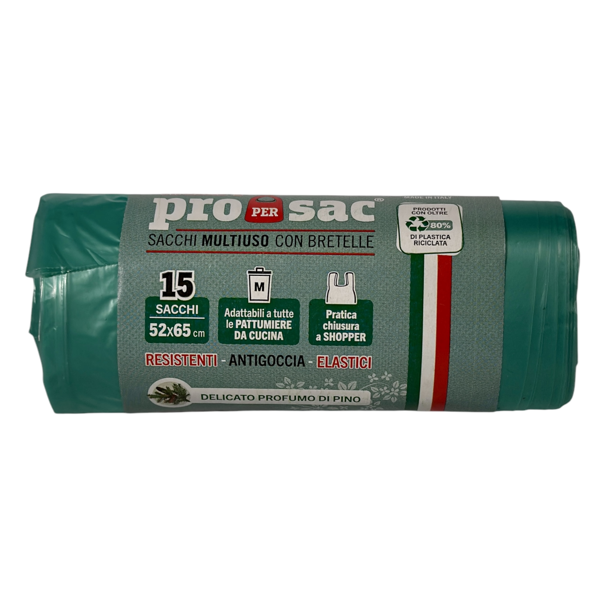 Пакети для сміття ProPerSac — це багатофункціональні пакети з ручками, розроблені спеціально для зручного використання в кухонних відрах середнього розміру. А ще — з приємним ароматом сосни! Вони виготовлені з 80% переробленого пластику, не пропускають рідину та не рвуться при навантаженні. Завдяки формі "майка", пакети легко зав’язуються та щільно тримаються на відрі. Купуючи у нас, ви отримуєте оригінальний італійський товар для внутрішнього ринку — висока якість, якої не знайти в пересічних супермаркетах.