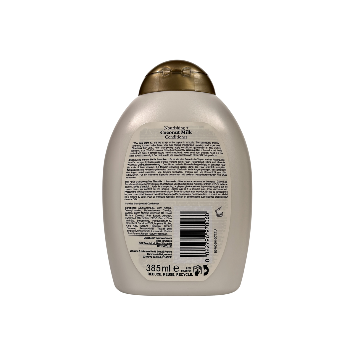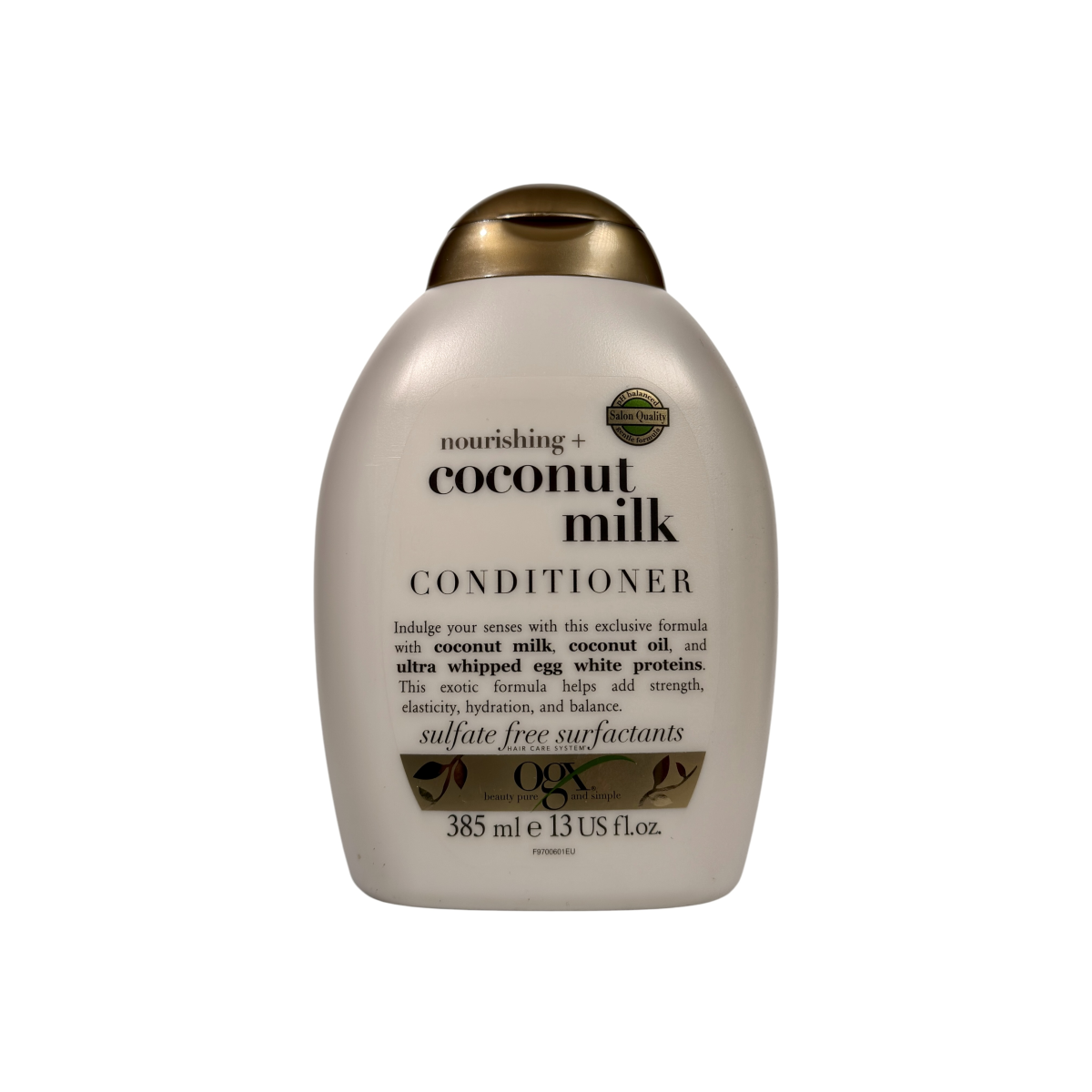 OGX Coconut Milk Conditioner — це розкішний засіб, який перетворює кожне миття голови на тропічне задоволення. Його насичена формула на основі натурального кокосового молока, кокосової олії та збитих яєчних білків забезпечує інтенсивне зволоження, відновлює еластичність та зміцнює волосся по всій довжині. Ідеально підходить для сухого, ламкого та пошкодженого волосся. Безсульфатна основа м’яко доглядає за шкірою голови та зберігає природний баланс.