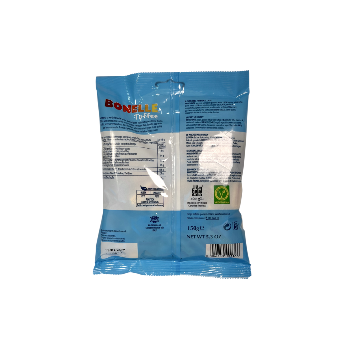 Ніжні італійські молочні іриски Bonelle Toffee al latte — це поєднання натурального молока, вершкової ніжності та м’якої текстури, що тане у роті.