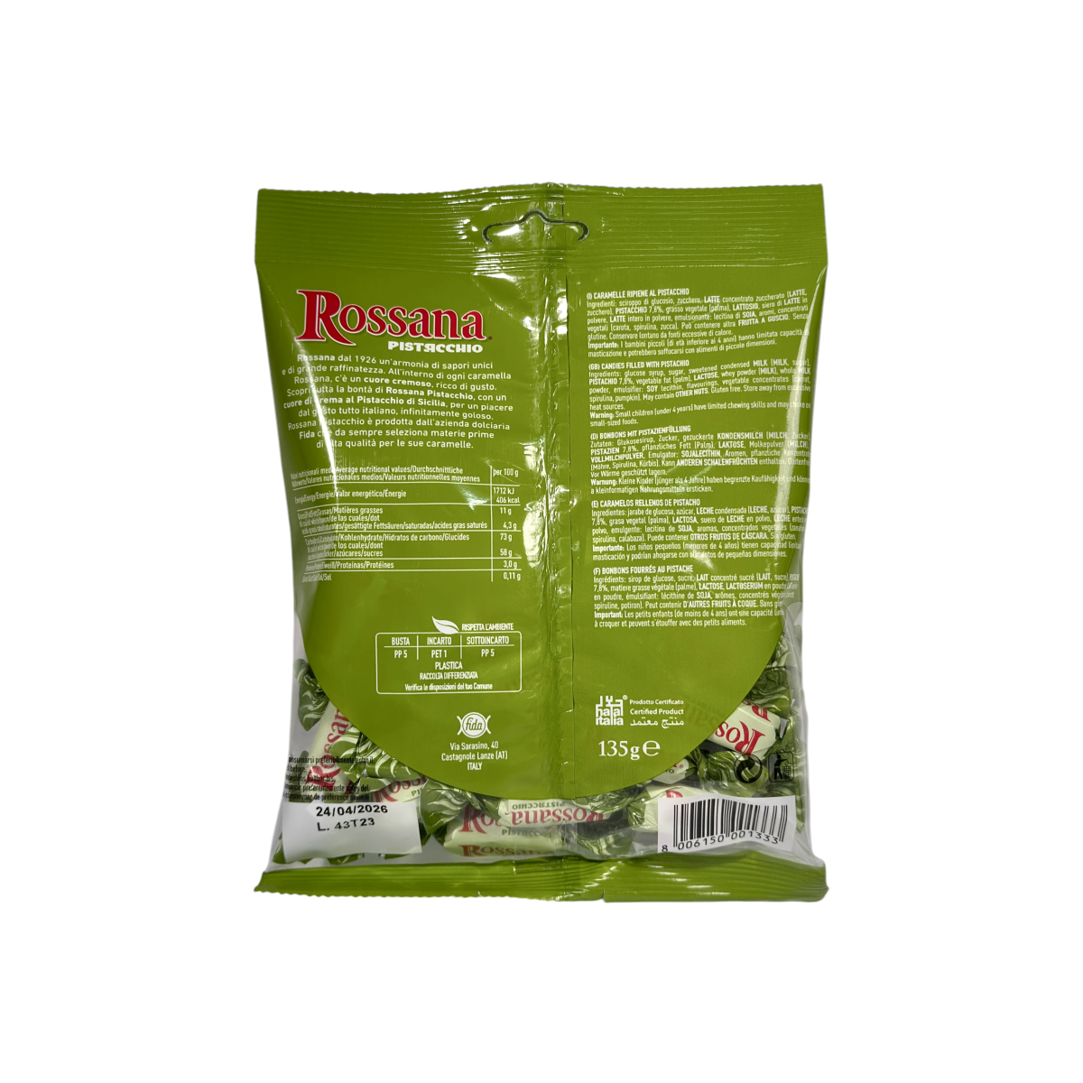 Італійські карамельні цукерки з м’якою фісташковою начинкою — гармонія класичного смаку Rossana та благородного аромату фісташки.