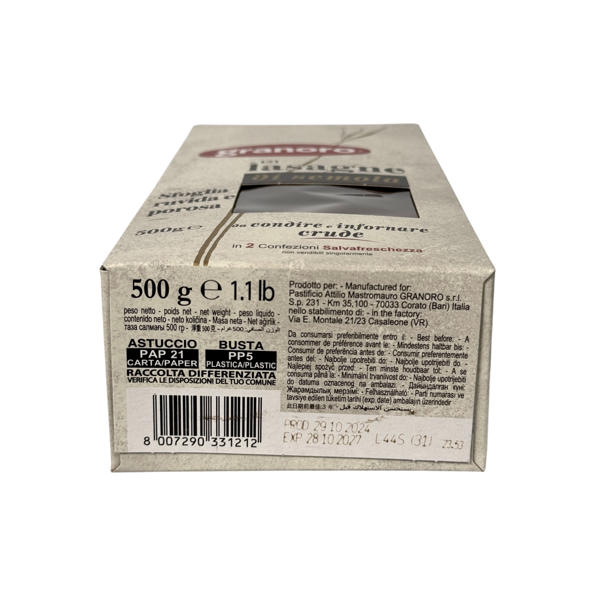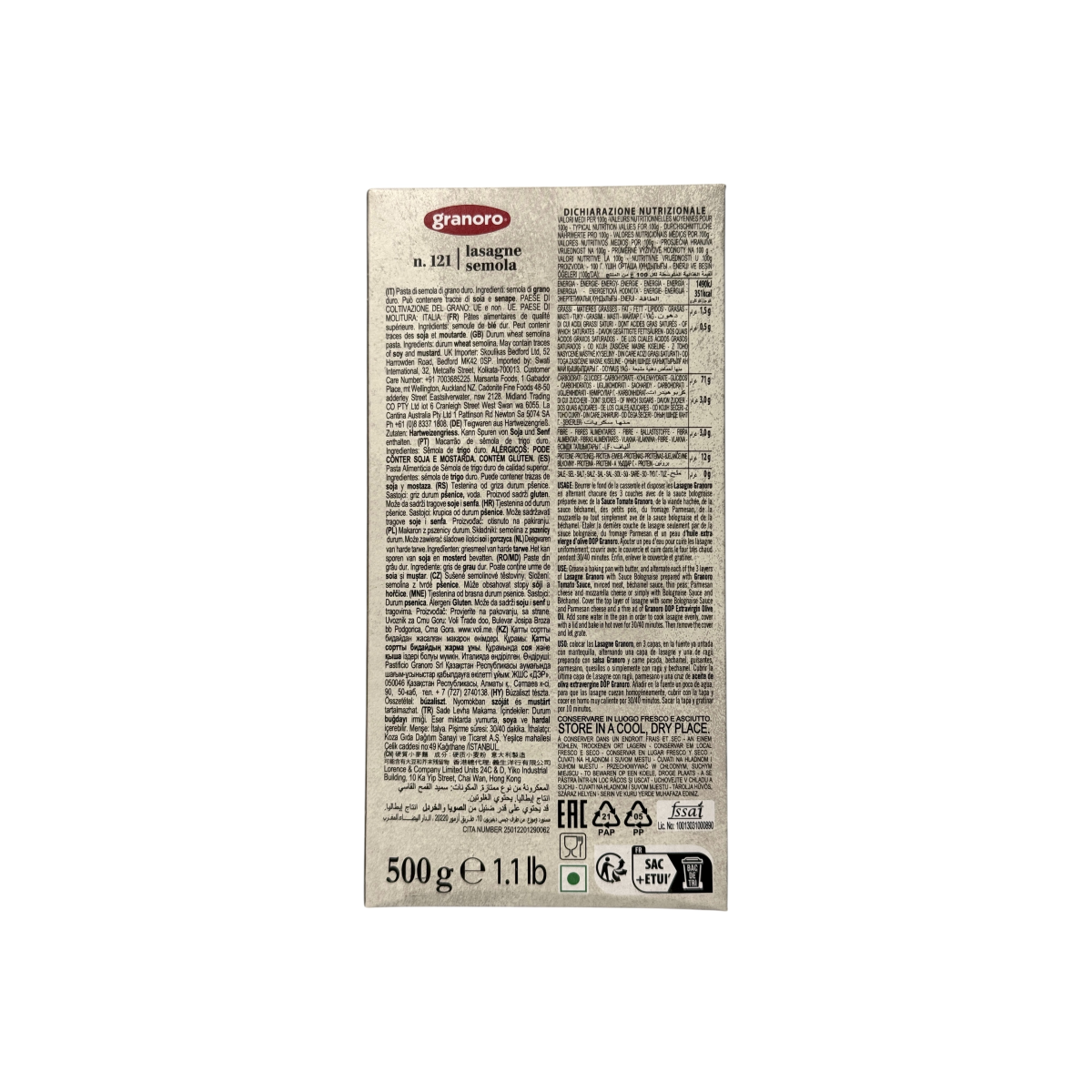 Завдяки пористій і шорсткій текстурі тіста, листи ідеально вбирають соус бешамель або томатний, створюючи ніжні, ароматні шари страви. Виробник Granoro — один із найвідоміших брендів пасти з регіону Апулія, Італія, що гарантує автентичну якість і стабільний результат при кожному запіканні.