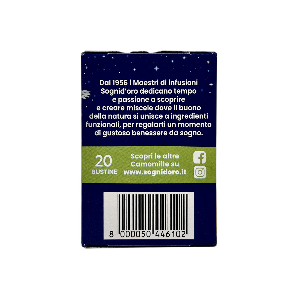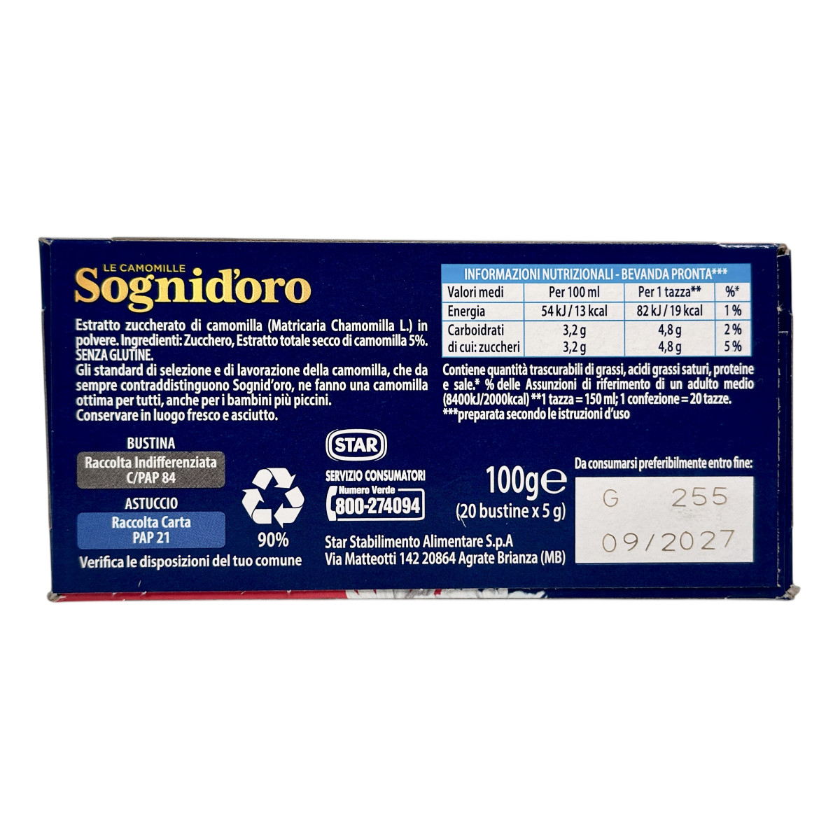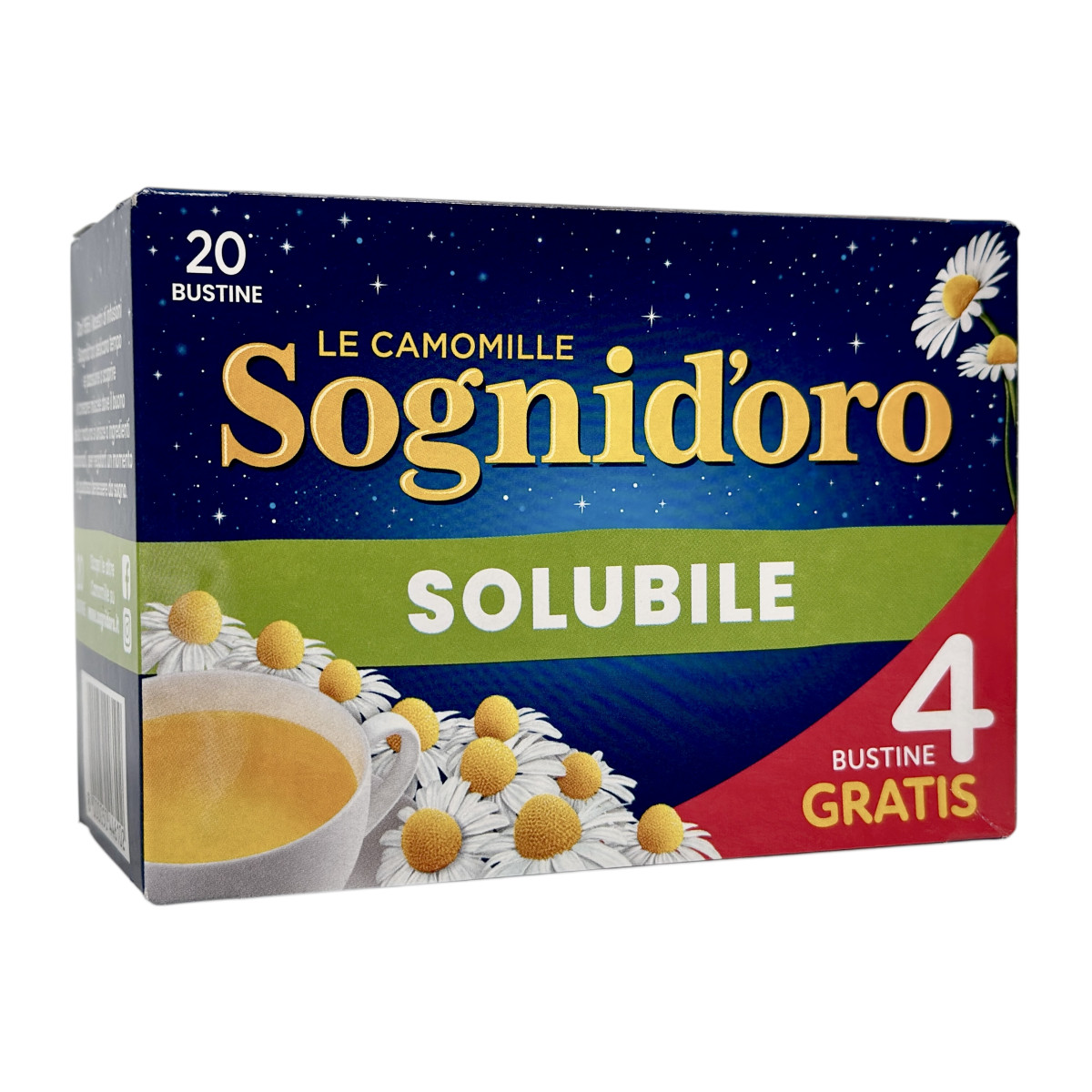 Sognid’oro — легендарна італійська марка компанії STAR, що з 1950-х років виробляє трав’яні чаї з ромашки найвищої якості. Серія Le Camomille Solubile створена для приємного вечірнього напою, який допомагає розслабитися після насиченого дня. У складі — лише натуральний ромашковий екстракт та цукор, без глютену й штучних ароматизаторів. Напій має м’який квітковий смак, приємний аромат і підходить навіть дітям.